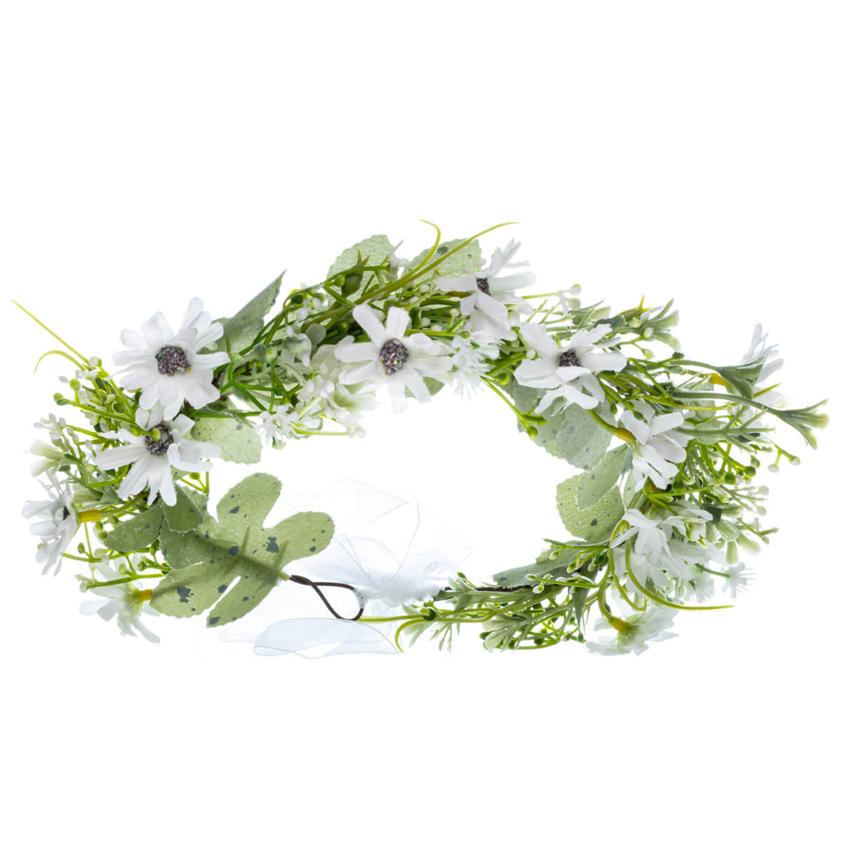 Kransen är handvävd av blommor som ser verkliga ut och friskt grönt bladverk. Den flexibla metallramen följer huvudets form utan att komprimeras och det genomskinliga satinbandet ger gott om justeringsmöjligheter - kronan sitter stadigt på plats från morgonsolen till nattens småtimmar.