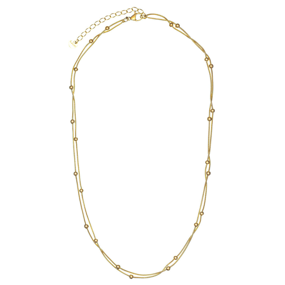 Det tvåradiga halsbandet har en generös halsringning. Den tunna runda kedjan är utsmyckad med runda stålpärlor. Smycket är helt tillverkat av kirurgiskt stål.