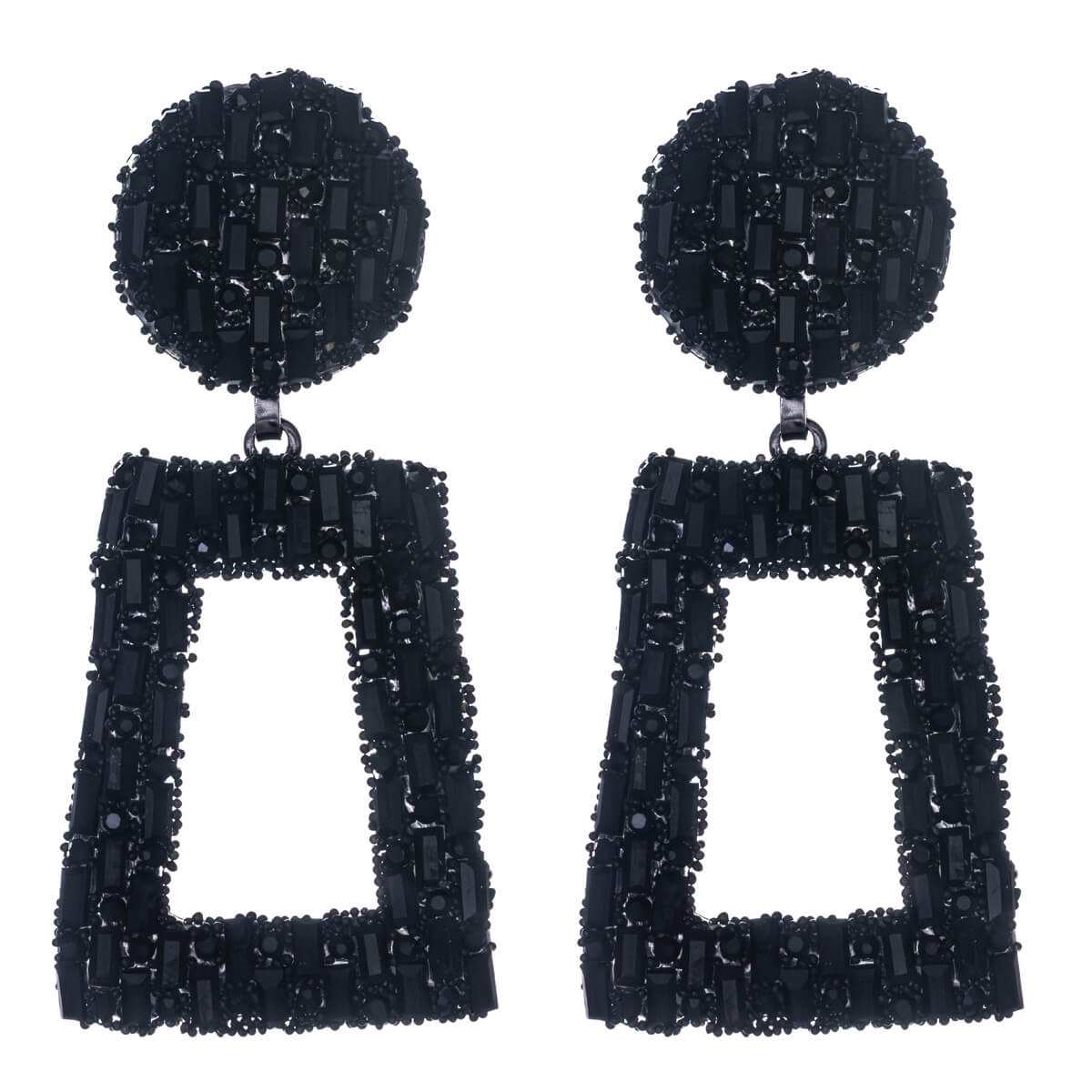 Dessa vackert glittrande svarta örhängen är stora och iögonfallande. Den runda formen återkommer i det kantiga stora hängsmycket. Dessa iögonfallande svarta örhängen är gjorda för fester – det råder det ingen tvekan om.