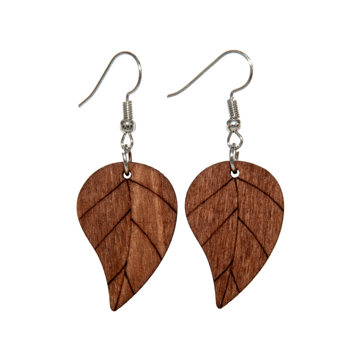 De hängande träbladen är mönstrade på träets yta. De hängande örhängena i trä är tillverkade i Finland. Produkten är lätt att bära. Örhängenas krokar är av säkert kirurgiskt stål.