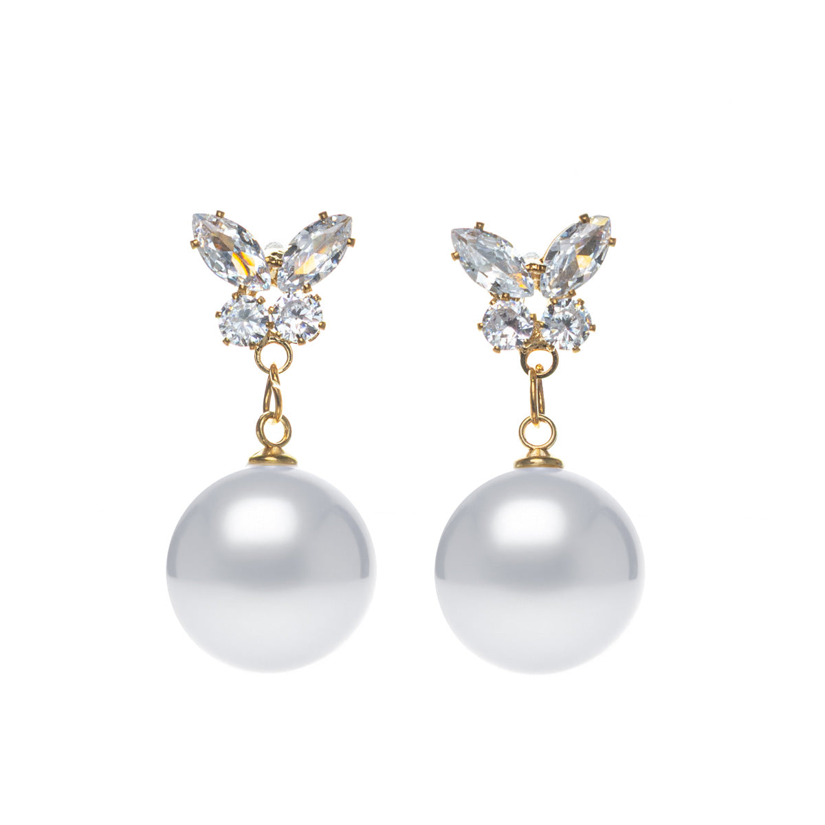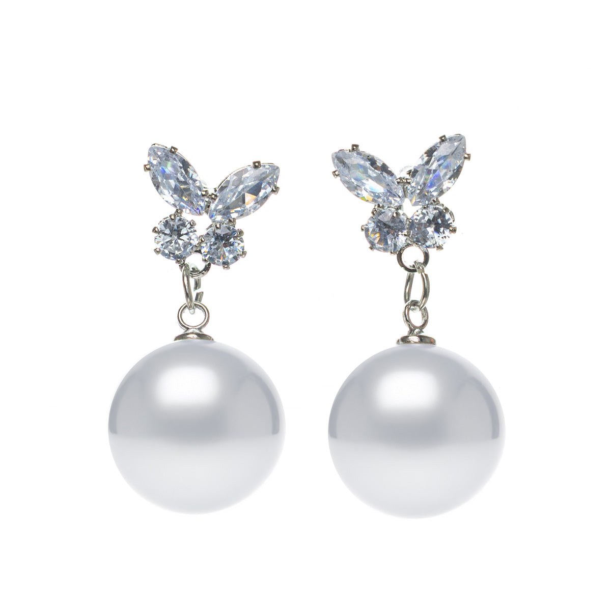 Zirkonia glasstenar skiner vackert i detta pärlörhänge. Pärlan hänger från en fjäril som bildas av glasstenarna.