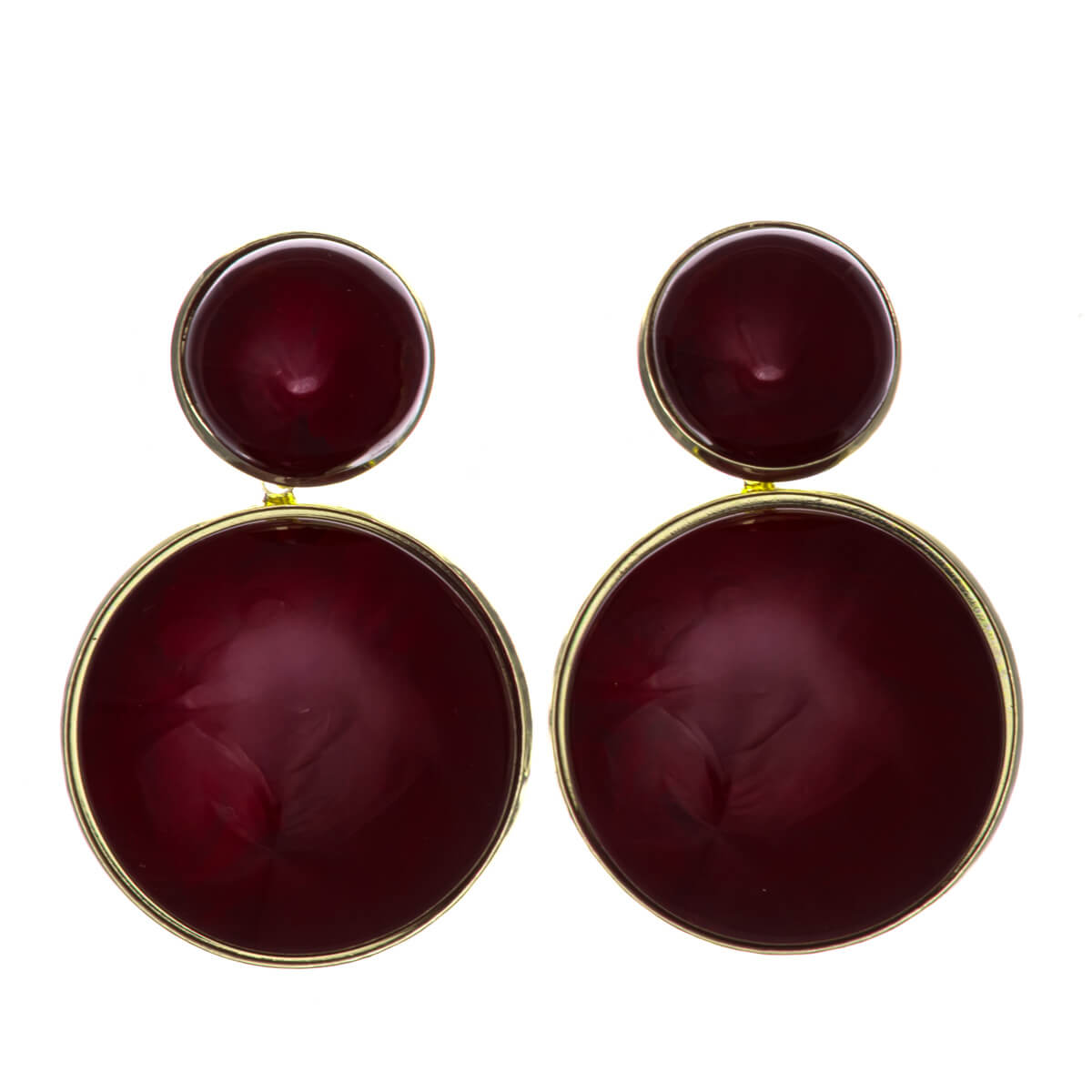 Dessa mörkröda runda örhängen ger garanterat färg åt din outfit. Den guldfärgade ramen passar perfekt till det mörkröda.