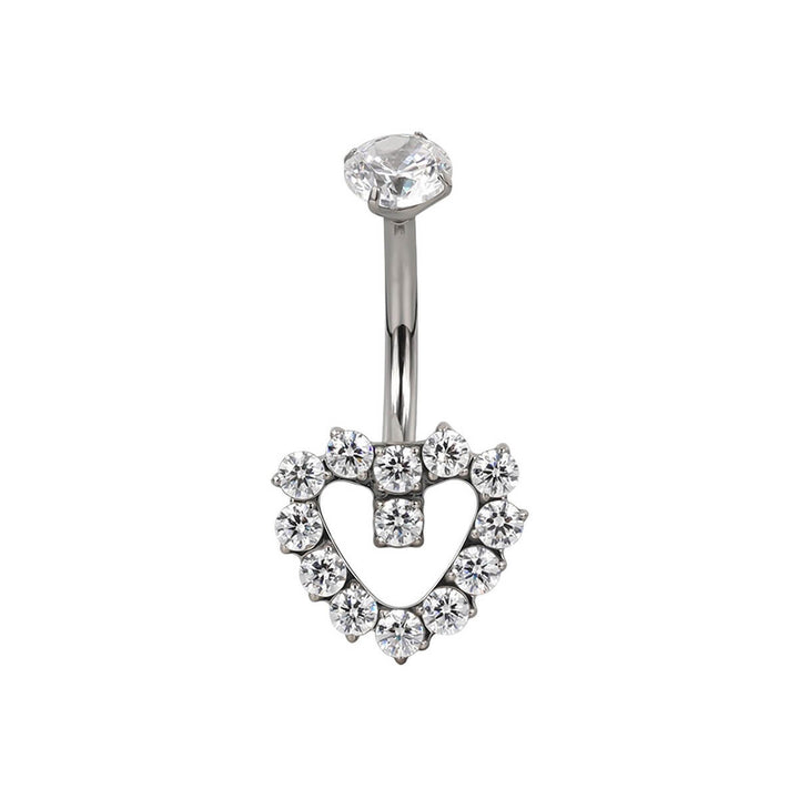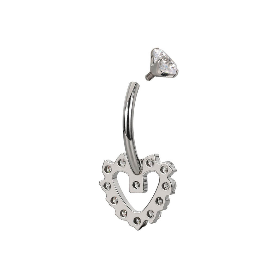 Hjärtknapphålet är tillverkat av små zirkoniastenar och en titanram. Zirkonia-stenarna är implanterade i ramen. Navelsmycket är invändigt gängat, dvs. ringarna på ovansidan skruvas fast i en böjd stift.