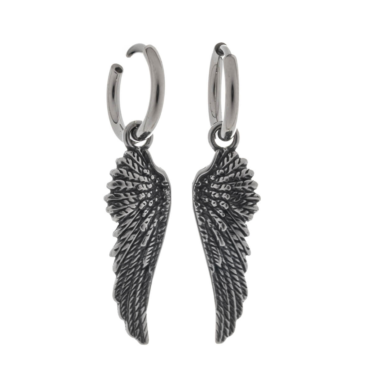 Dessa örhängen för män är försedda med en slående vinge-hänge, vars detaljerade design ger smycket ett starkt utseende och rörelse. Vingarnas form symboliserar frihet och kraft, vilket gör örhängena till ett iögonfallande men ändå tidlöst val.