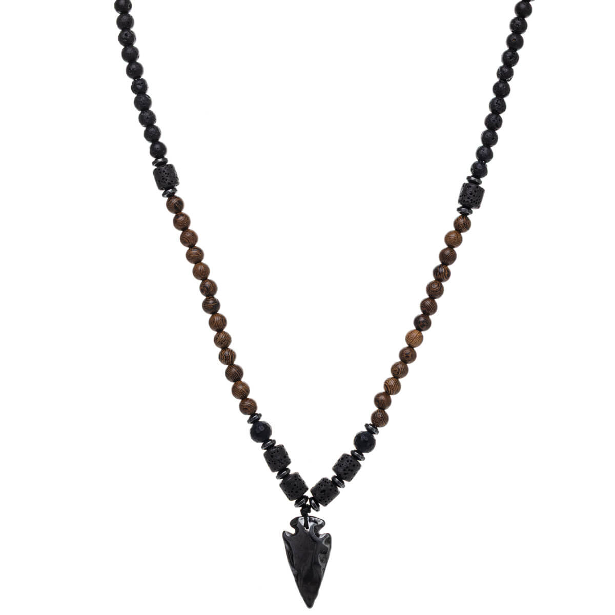 Långt pärlhalsband 75 cm – trä och sten, pilhängsmycke