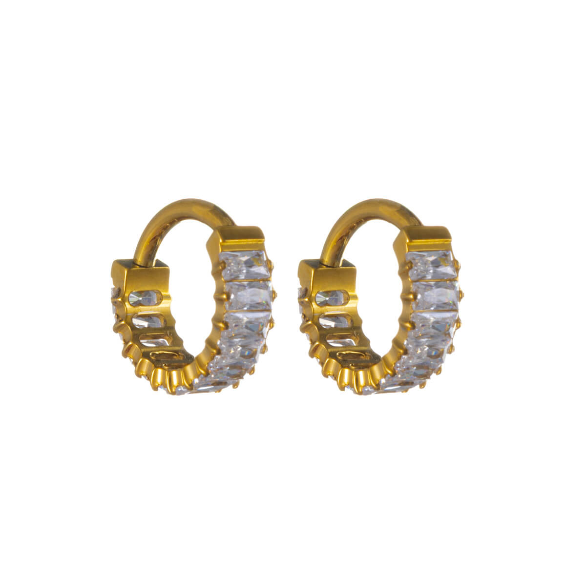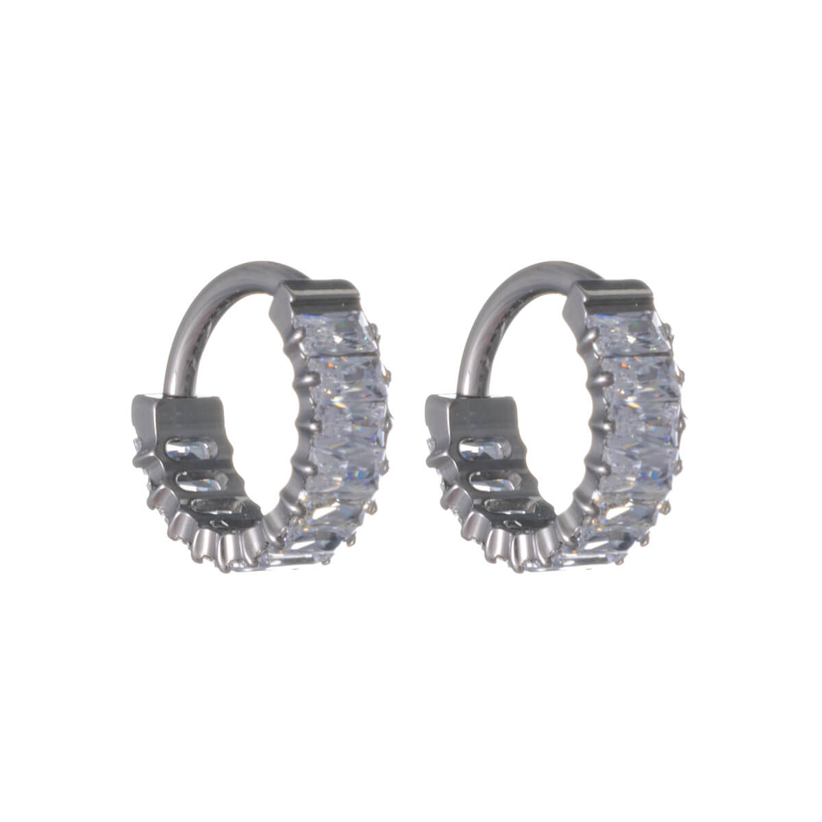 Framsidan av örhänget pryds av en rad glittrande rektangulära baguette-zirkonia-stenar, som är infattade i en precisionsbearbetad kanalinfattning. Den enhetliga raden av stenar ger smycket ett elegant och lyxigt utseende som ger glans åt både festkläder och stilfulla vardagskläder.