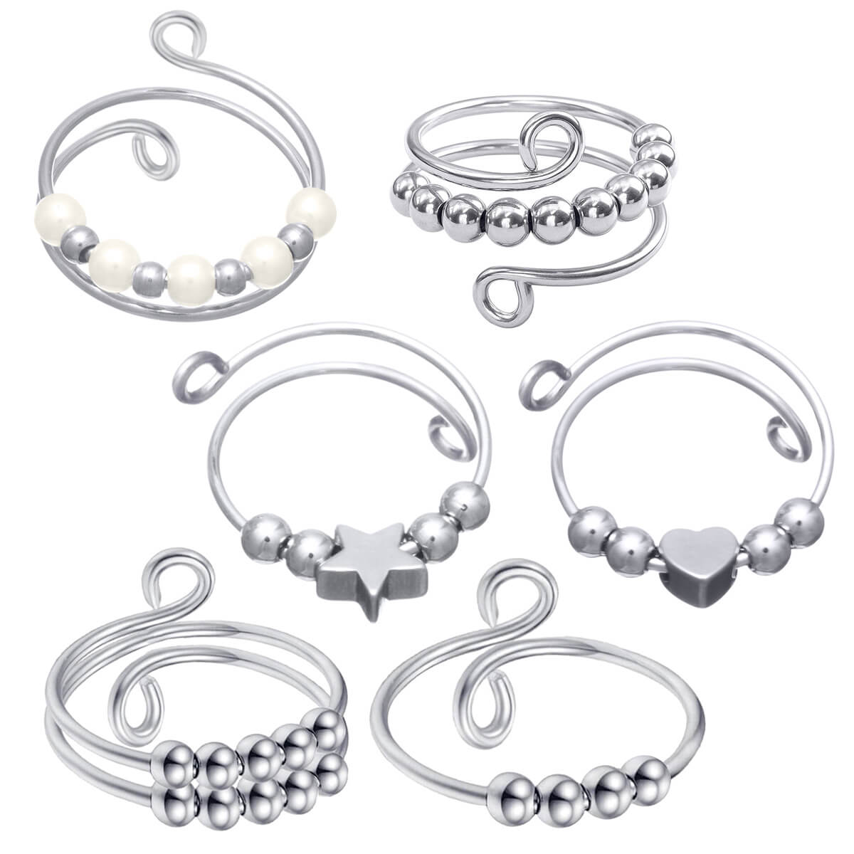 Calm your mind and relieve stress in style! This set of six silver-toned stress rings combines a variety of bead and decoration options – the perfect choice for those who want variety in their everyday life or want to wear a stress ring on different fingers depending on their mood.