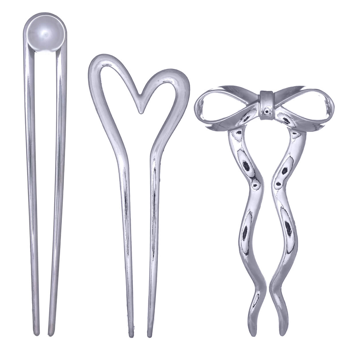 All models are made of durable metal and have a shiny, luxurious finish. Decorated with a beautiful bow, heart, and pearl, they add a polished and eye-catching touch to any hairstyle.