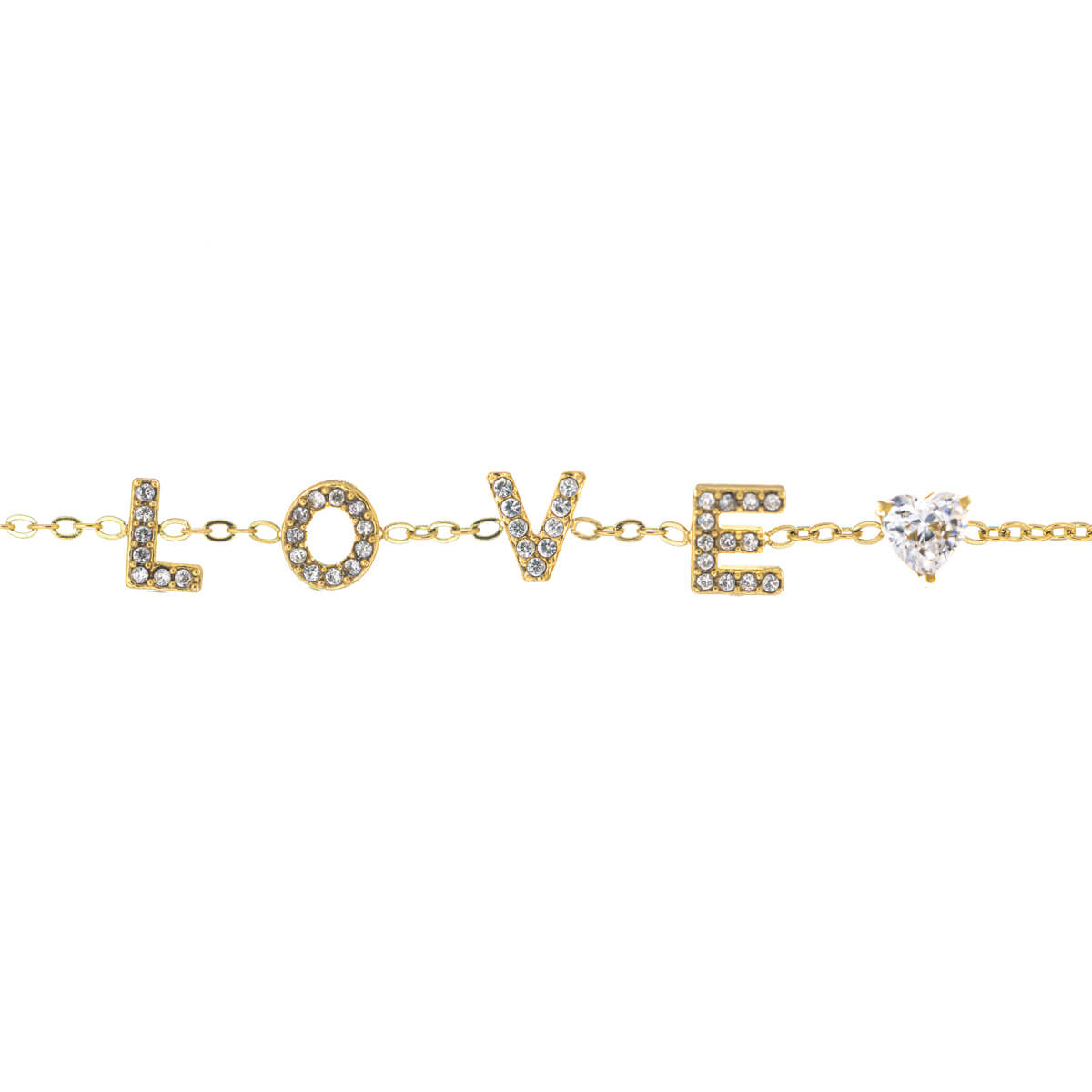 The thin bracelet is adorned with Love text, the letters of which are decorated with zirconia stones. After a test, the bracelet features one heart-shaped zirconia stone. The bracelet is entirely made of surgical steel.