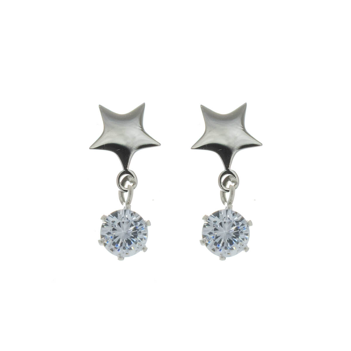 Clear glass stones sparkle beautifully in these earrings. This design features a small star pendant dangling from a delicate glass stone.