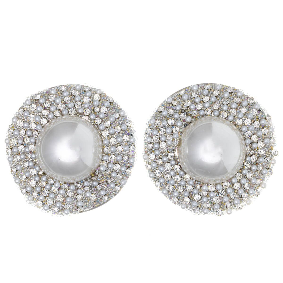 Sparkling earrings are a classic party accessory. In this model, the large pearl is adorned with a wavy border decorated with pearls and rhinestones.