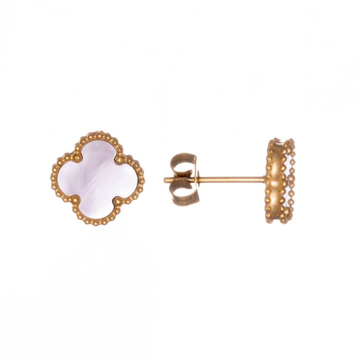 Timeless and trendy four-leaf clover flower earrings that combine a minimalist shape with an elegant pearl surface. This earring model is currently popular thanks to its clear, luxurious, and easily combinable design.