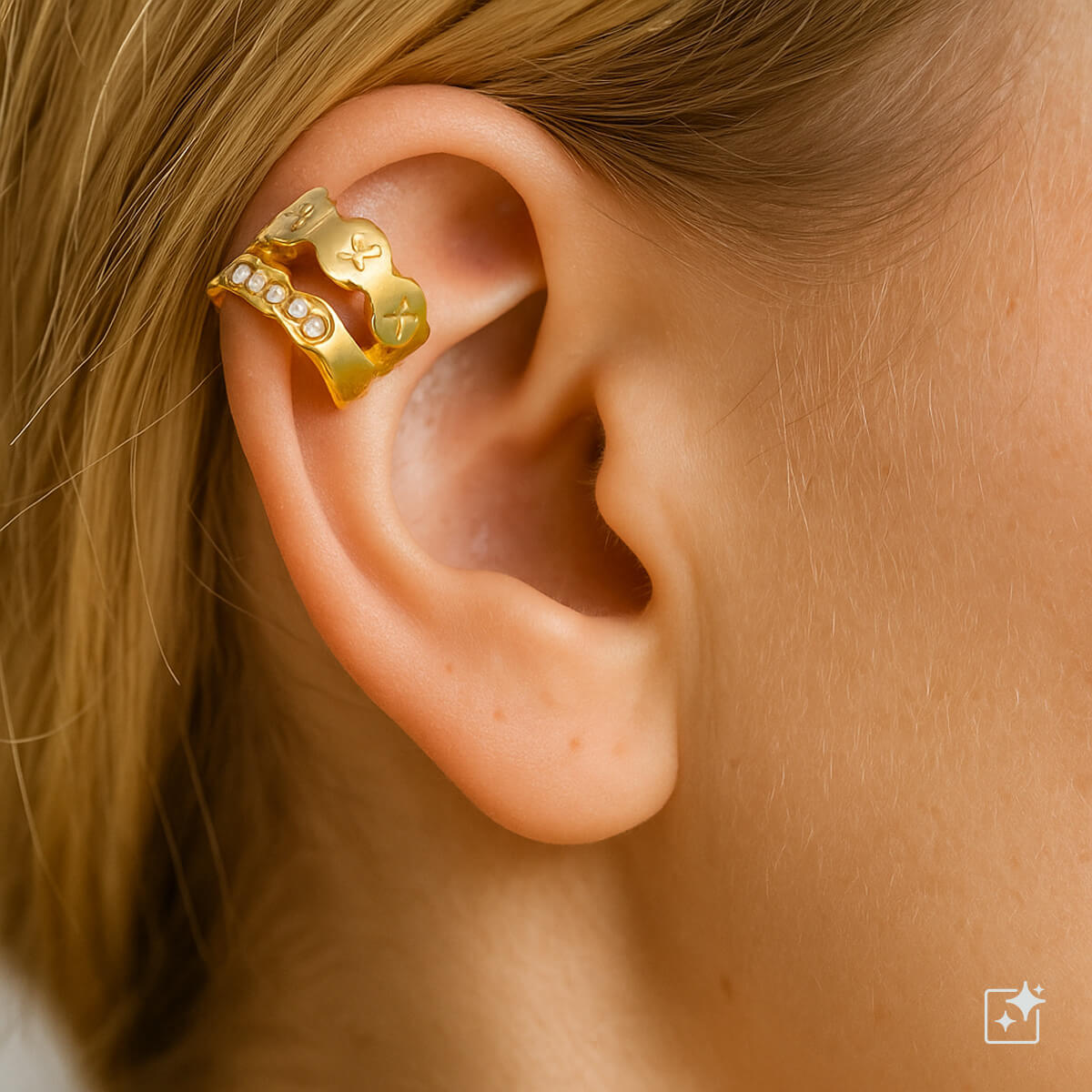 The decorative ear cuff is an elegant detail on the ear. The simple rustic earcuff is beautiful and timeless. The earcuff does not need a hole. The cartilage remains between the earring and the earring is almost pressed closed.