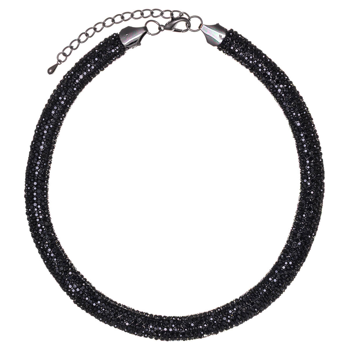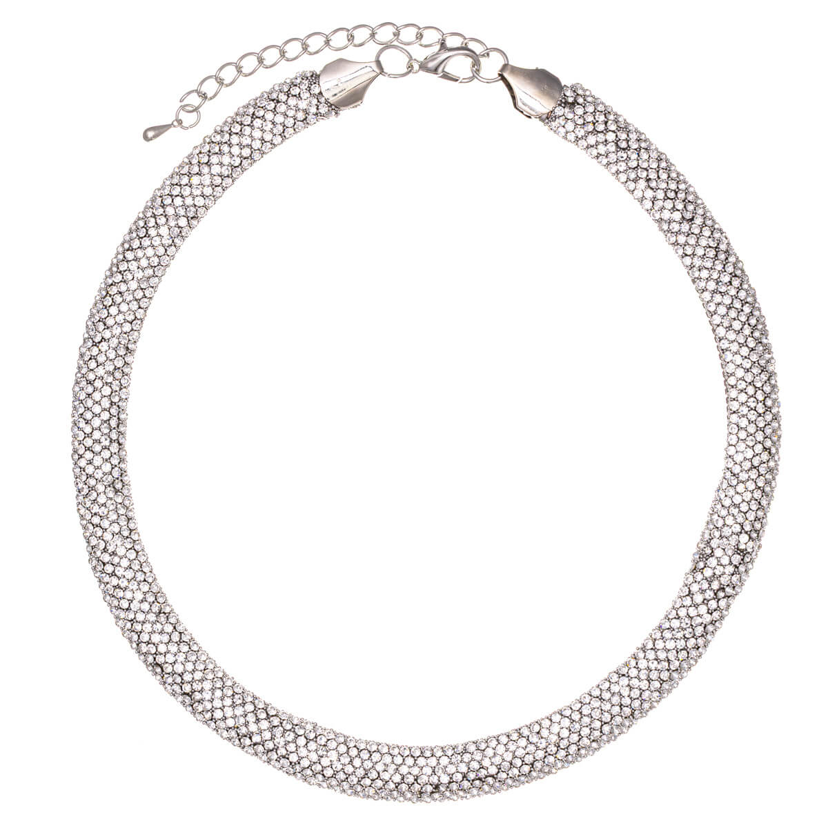 This round-shaped collar necklace adds a touch of sparkle. In this model, the metal frame is covered with abundant sparkle.