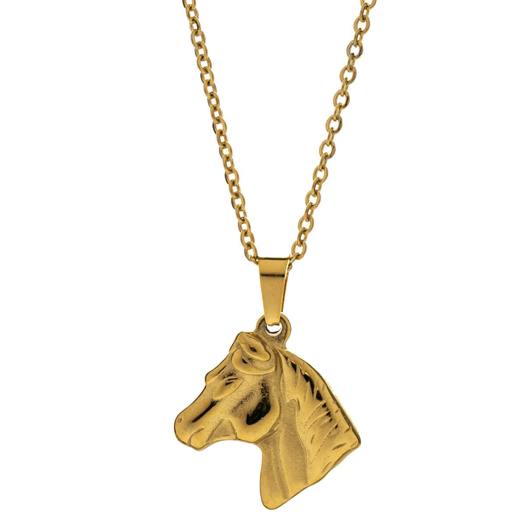 Steel horse head pendant necklace will last through use well. The graceful pendant is on a thin steel chain. The jewellery is made of surgical steel.