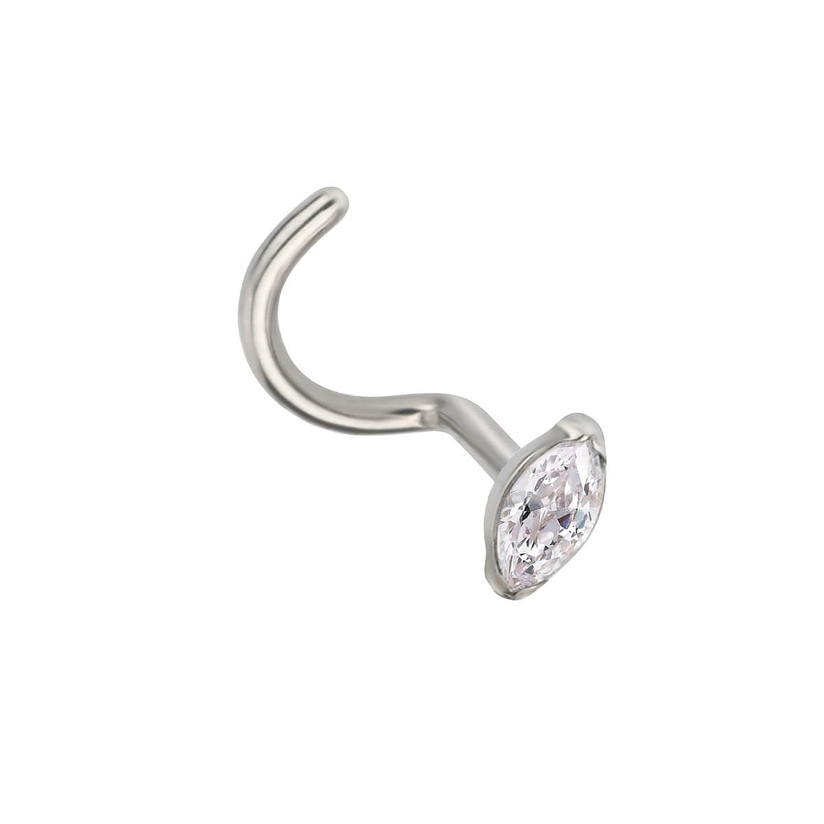 A beautiful marquise zirconia stone sparkles like a diamond in this nose piece. This model has no clasps but is pre-bent into a spiral shape and slips into a nose piercing.