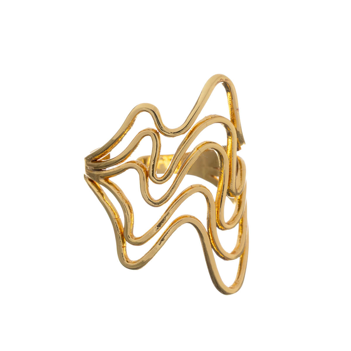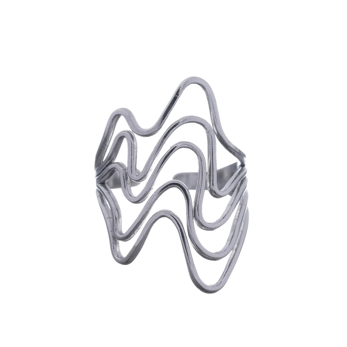 This wide, multi-layered open ring is an adjustable one size fits all ring. The wavy structure consists of several parallel metal strands. The ring is made entirely of steel.