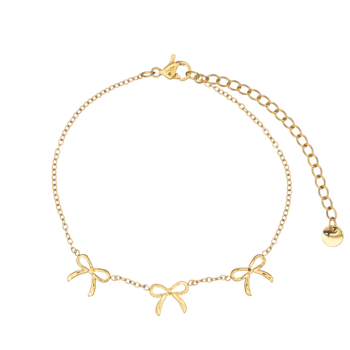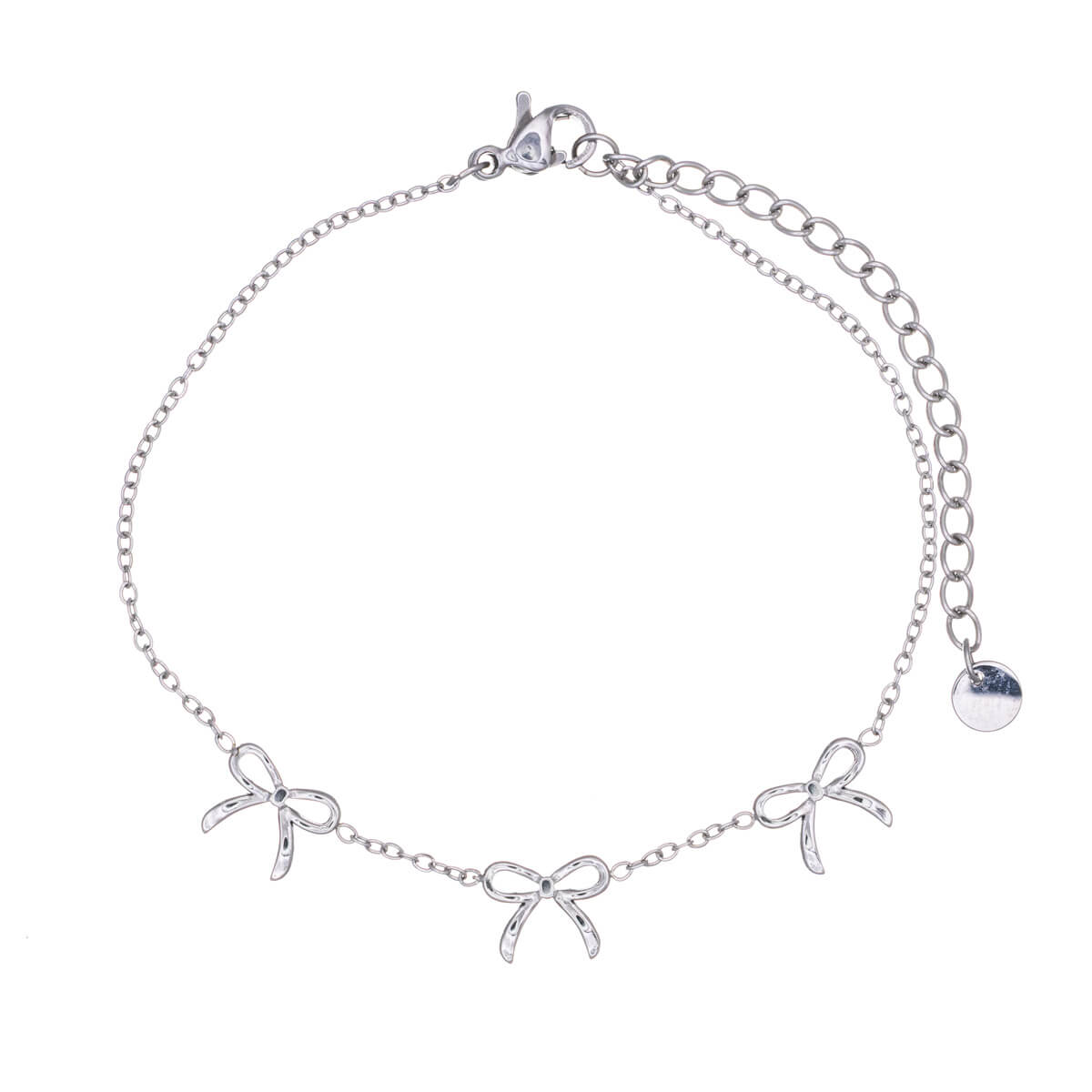Three small bows are beautifully embedded in a thin bracelet chain. The bracelet is made entirely of surgical steel. The product will not wear out in use.