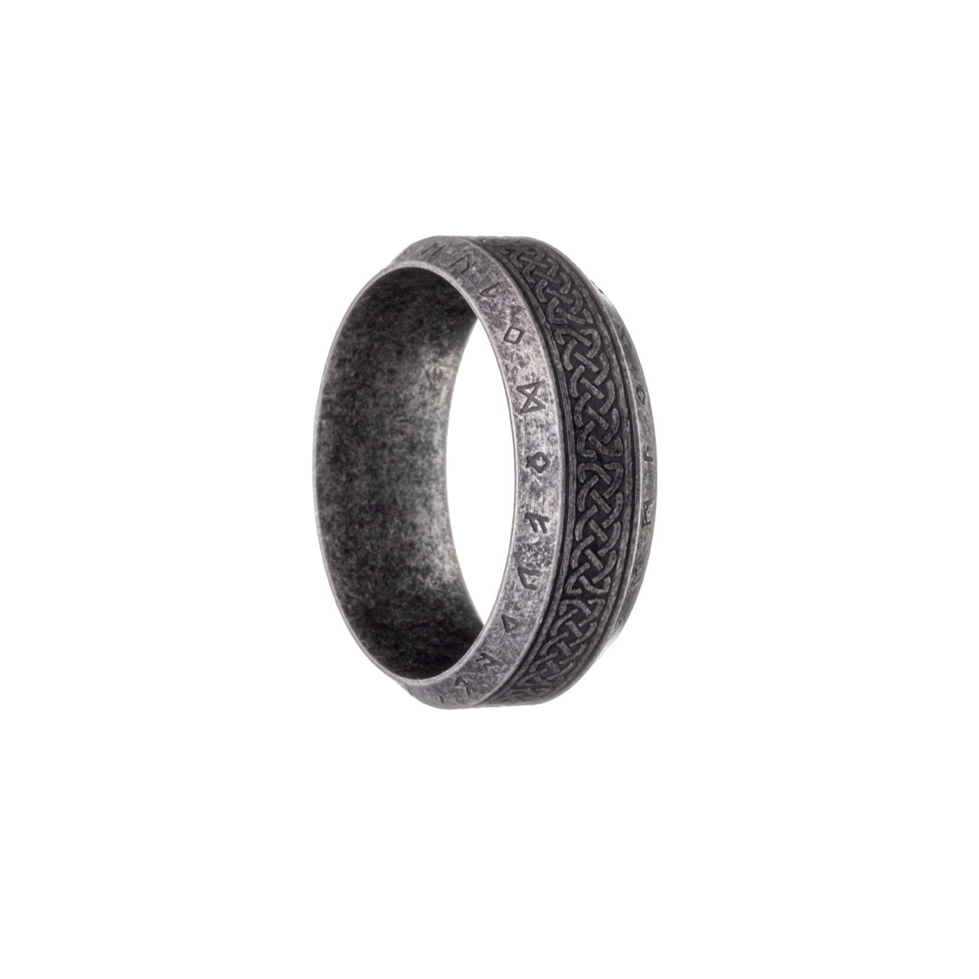 A Celtic knot pattern wraps around the centre of this ring. The beveled edges of the ring contain symbols from ancient Norse mythology. The elegantly detailed ring is sure to hide many a story underneath.