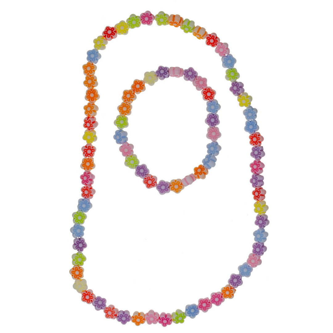 Colourful plastic beads are shaped into flower shapes in this necklace. The beads are strung on a silicone cord.