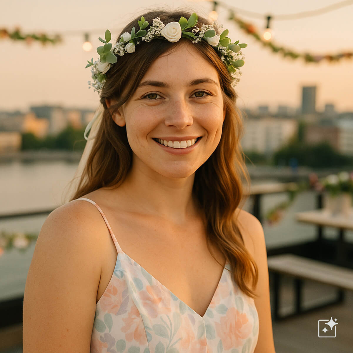 The wreath is a masterpiece of craftsmanship: real-looking artificial rose buds, gossamer-like lace branches and succulent eucalyptus leaves are tied to a thin, malleable metal frame. The satin ribbon adjustable size ensures that the crown fits comfortably and stays in place for photography and dance steps alike.