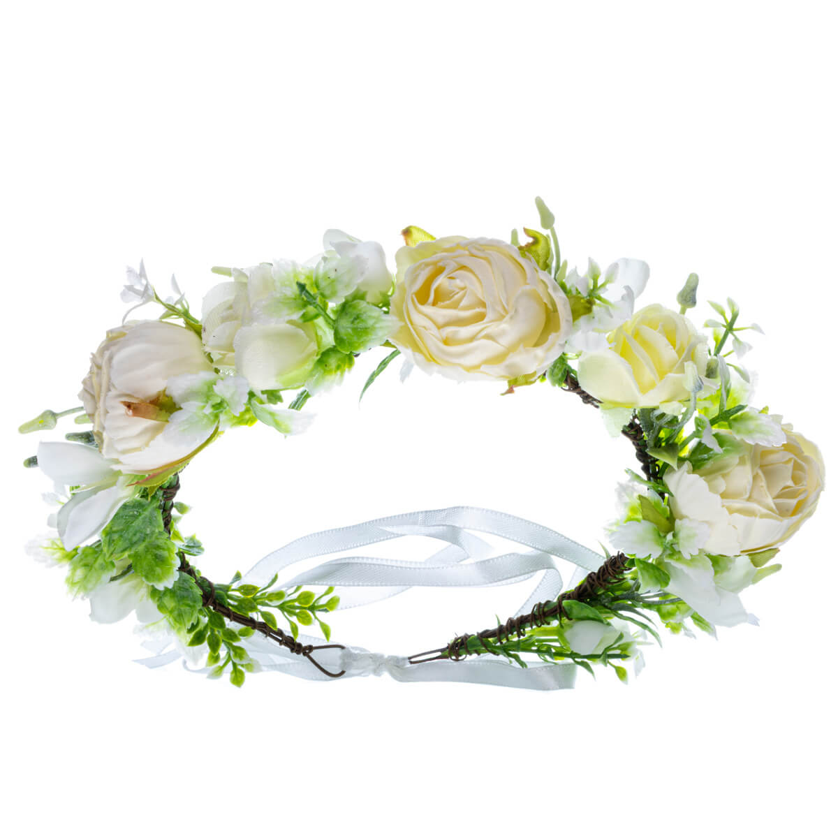 Each rose bud and fresh green leaf is hand-arranged from realistic-looking artificial flowers, so the crown looks freshly picked all day long. The flexible metal frame follows the shape of the head without compression, and the narrow, shimmering satin ribbon gives plenty of adjustability - the wreath stays in place through wind and dance steps alike.