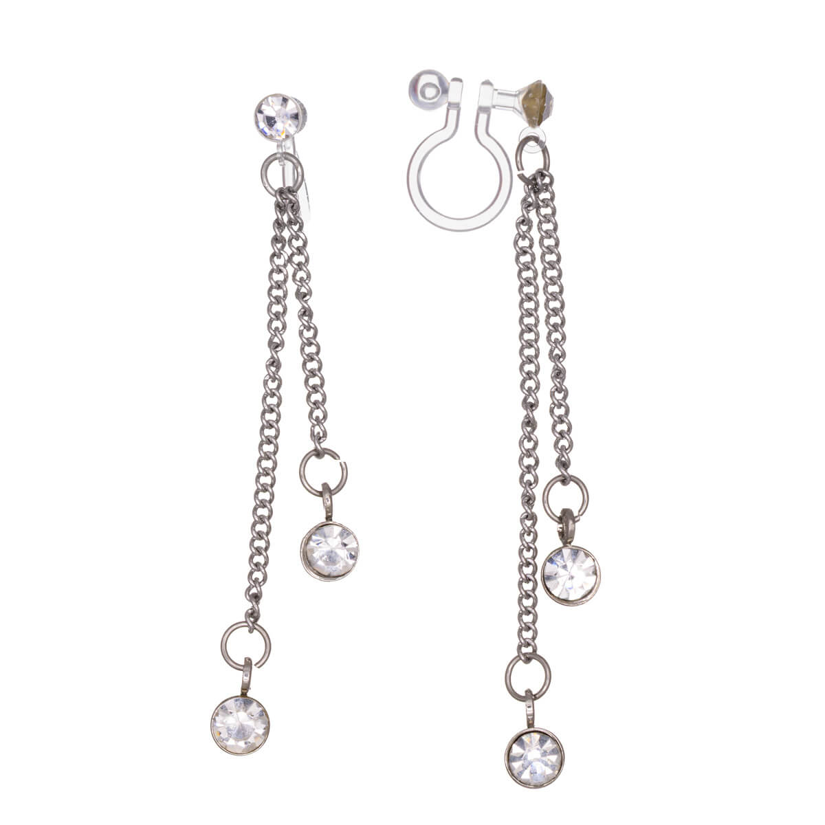 Chain Clip-on earrings are decorated with glass stones hanging from the ends of the chain. The clip mechanism is very discreet and comfortable to wear.