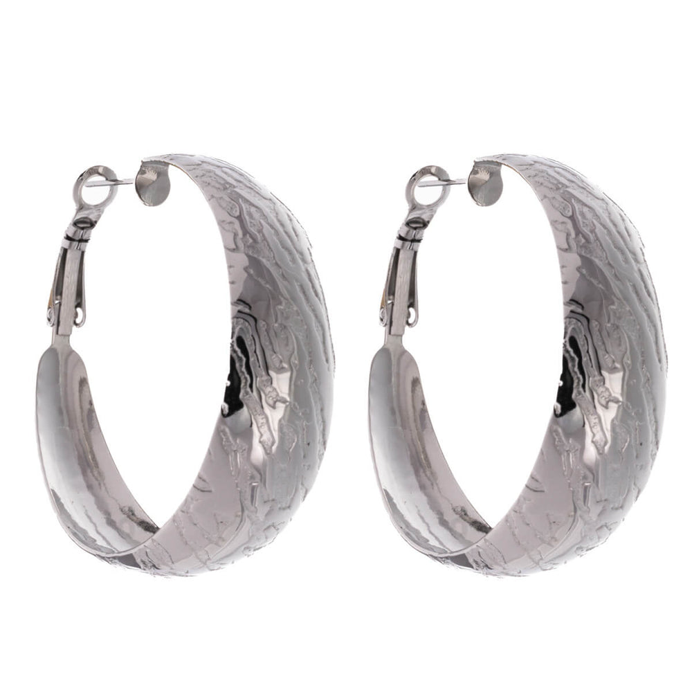 Steel wide earrings are stylish and durable. The hinged flap is easy to open and snap back onto the earring spike. The product is made entirely of steel.