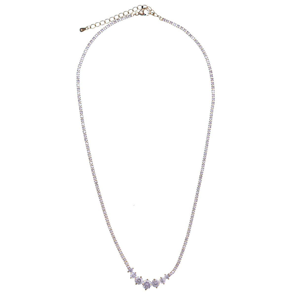 An elegant and eye-catching multi-stone zirconia necklace, with the front of the necklace beautifully decorated with zirconia stones. The larger stone in the center adds structure to the necklace, while the smaller stones surrounding it create a harmonious and balanced look. The classic design elegantly completes a festive outfit and adds sparkle to the neckline without the need for a separate pendant.