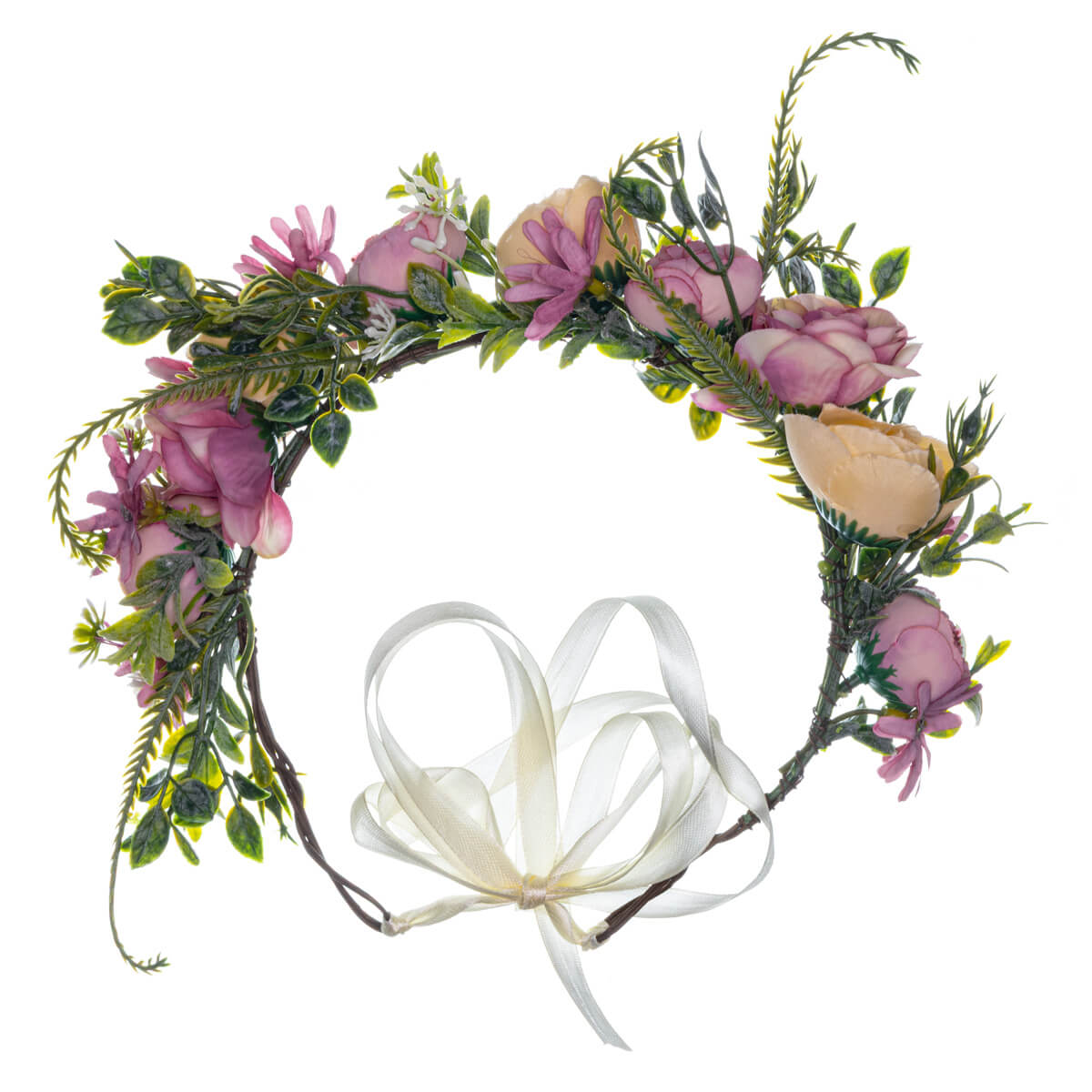 The wreath is handcrafted from realistic-looking artificial flowers and natural-looking foliage. The flexible metal frame follows the shape of your head comfortably, and the narrow, pearl-white satin ribbon offers plenty of adjustability - the crown stays in place from dance to breeze.