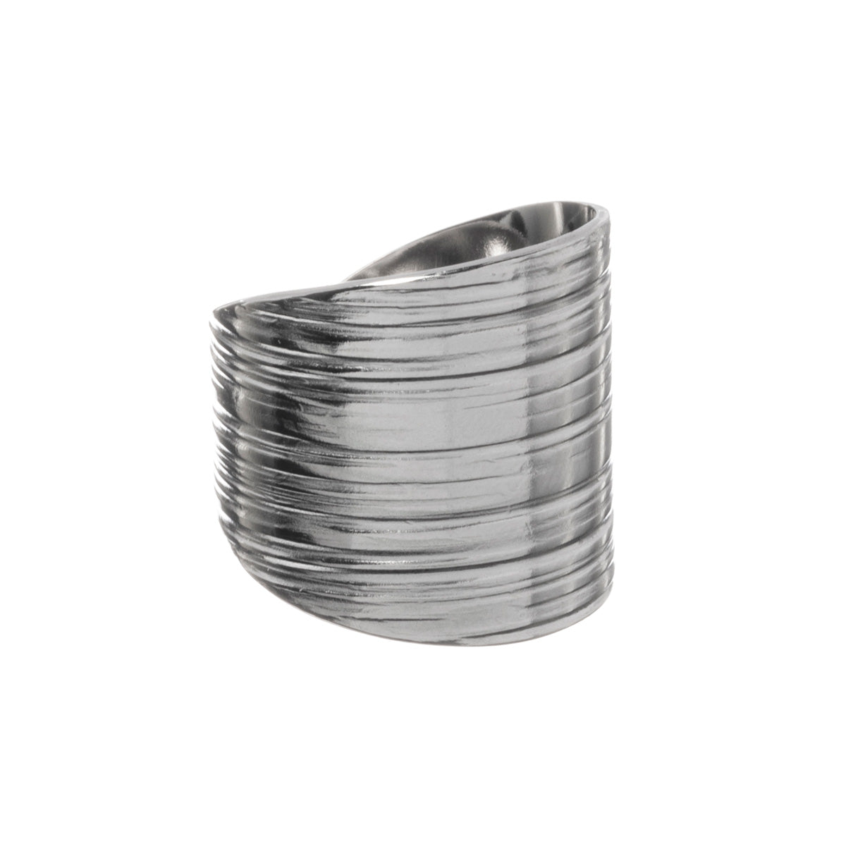 The wide ring is a beautiful shield-shaped piece of jewellery. The surface of the ring has beautiful grooves as a detail. This ring can be easily changed between fingers as it is adjustable. The one size steel ring is easy and convenient.