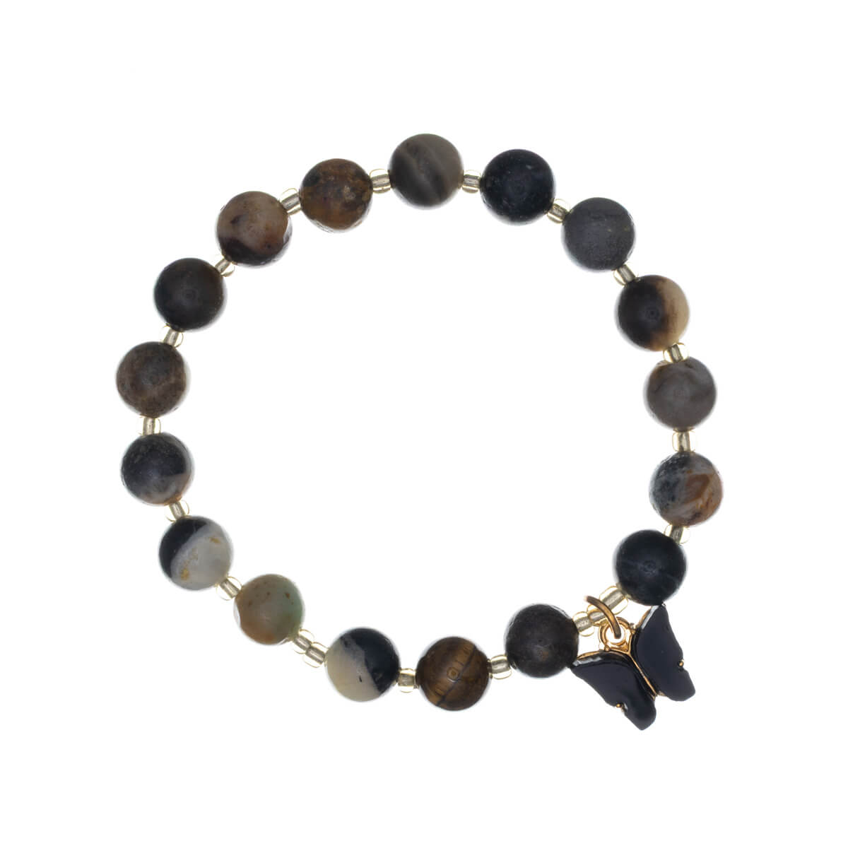Färgglada stenpärlor passar till många outfits. Det elastiska silikonbandet behöver inget separat spänne, utan armbandet glider lätt på handleden. Armbandet har ett hänge i form av en fjäril.