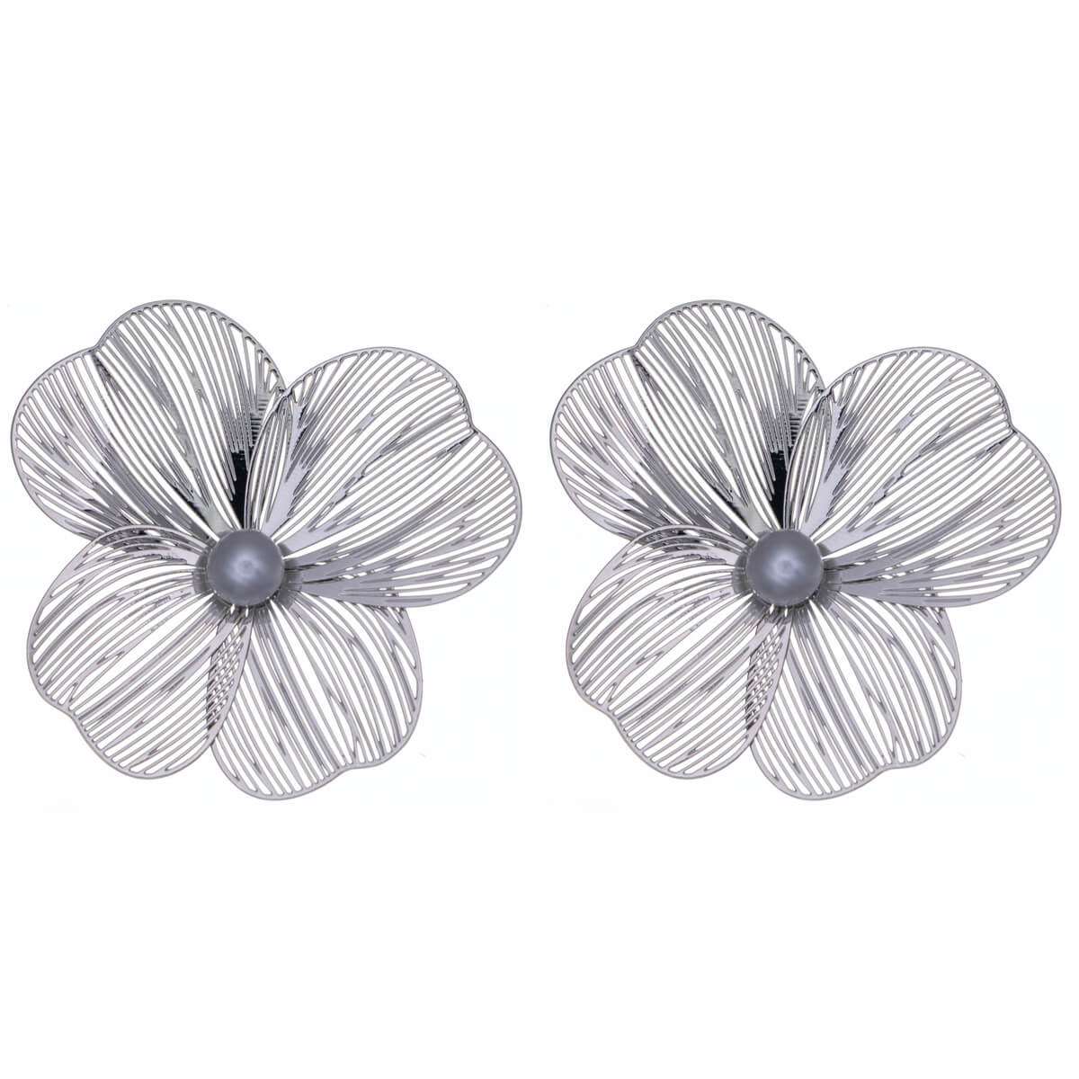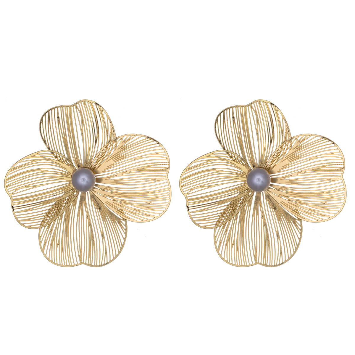 Stora tunna blomblad bildar ett vackert örhänge. Blommans mitt är dekorerad med en liten plastpärla. Produkten är tillverkad av stål. Den smala designen gör örhänget lätt.