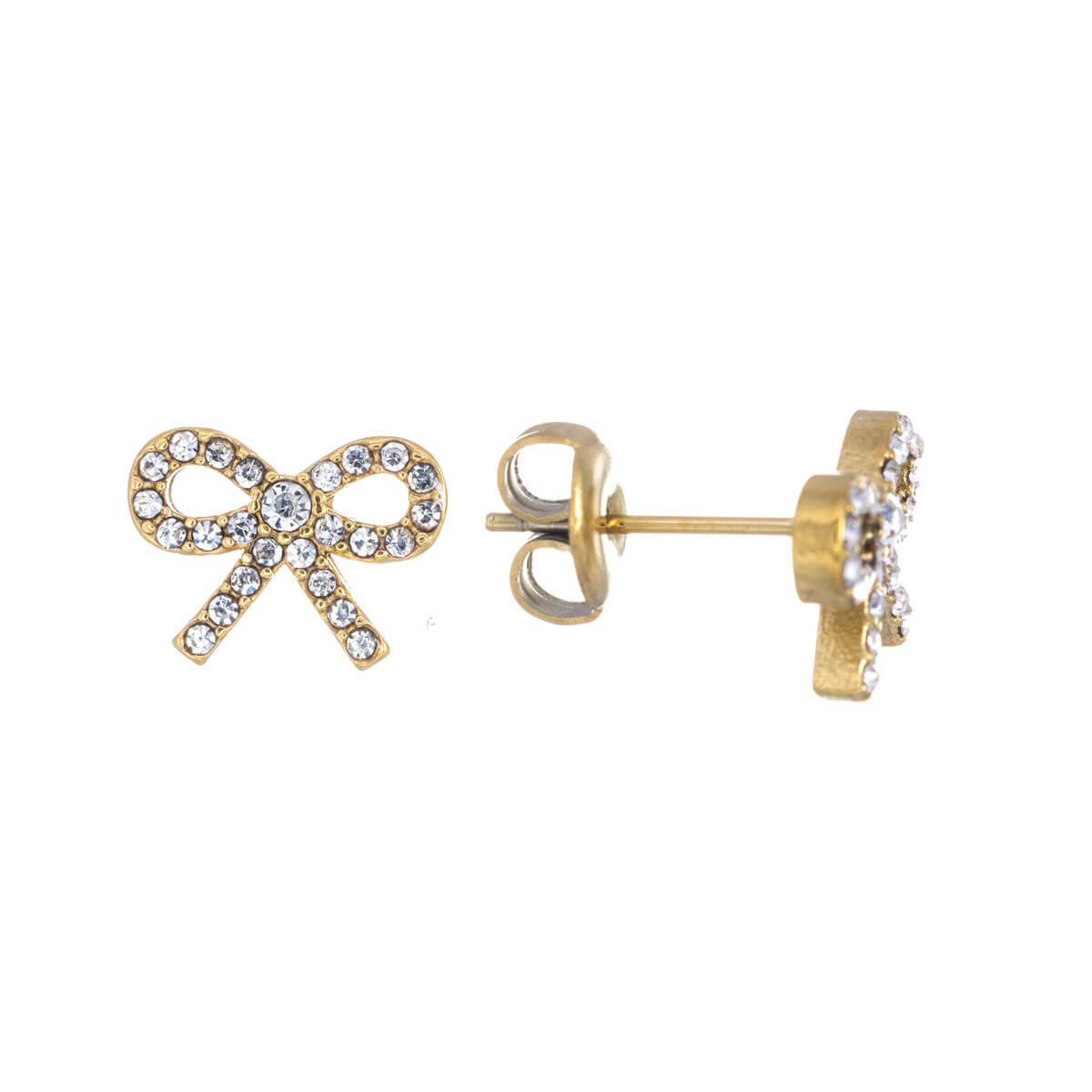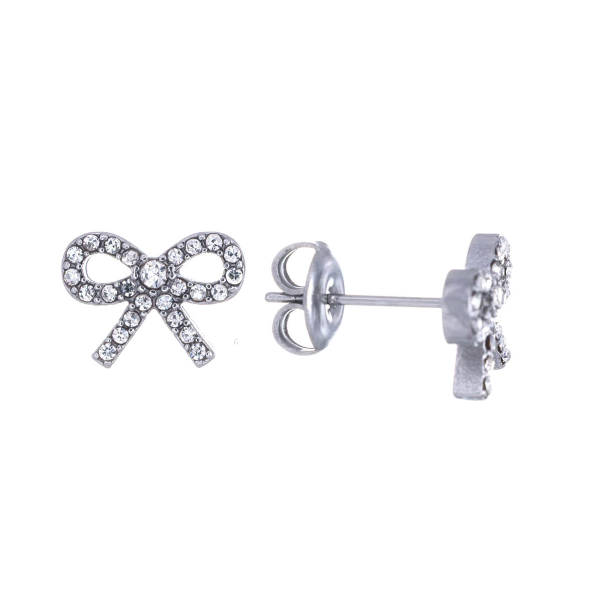 Bow tie-örhängena i stål är vackert graciösa. De små bågarna är dekorerade med klara glasstenar. Örhängena är tillverkade helt i kirurgiskt stål, så de kommer inte att slitas ut vid användning.