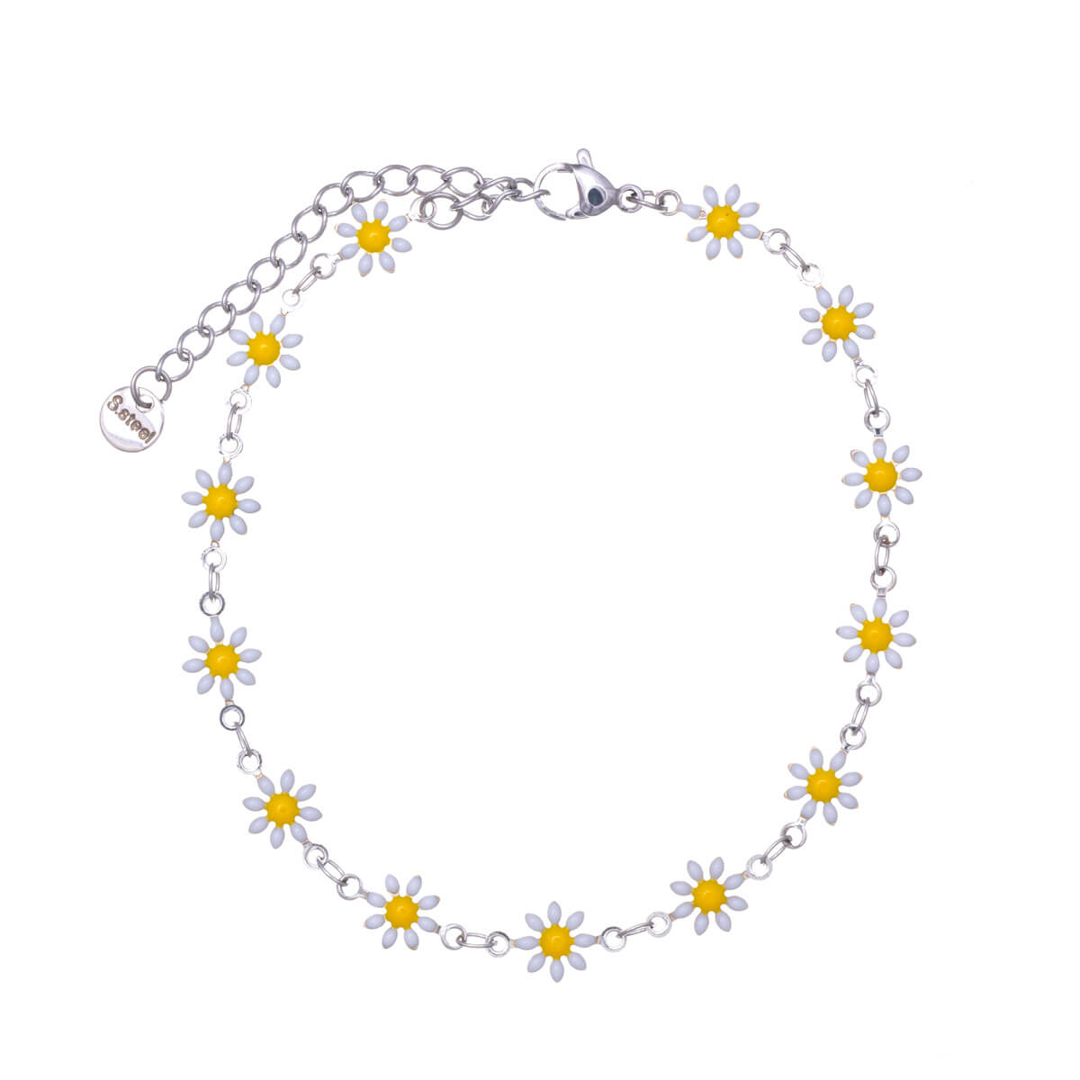 Detta hållbara och snygga smyckesset i daisy-stål består av ett halsband, ett armband och ett armband. Ankelarmband, perfekta accessoarer för sommardagar. Varje smycke är tillverkat av högkvalitativt kirurgiskt stål (316L-stål), som tål slitage. Tack vare chiron-designen och de sofistikerade detaljerna är detta set perfekt för både barn och vuxna.