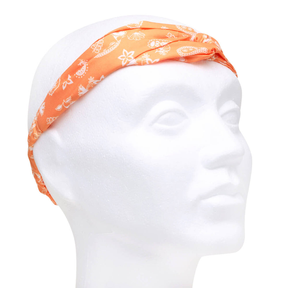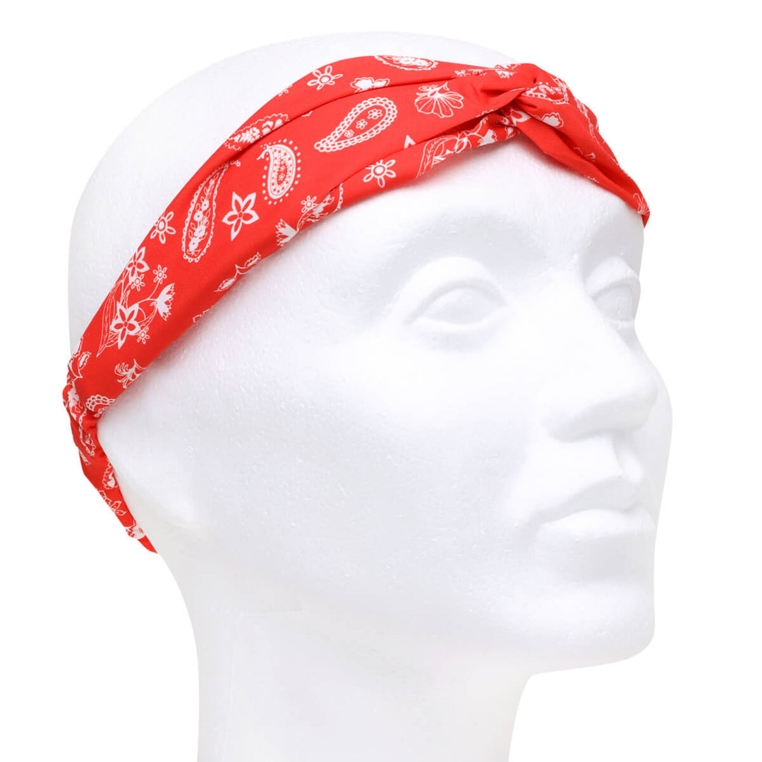 Ett elastiskt hårband är alltid en enkel lösning. Det elastiska hårbandet är bekvämt att bära och klämmer inte. Vackert bandana-mönster dekorerar tyget