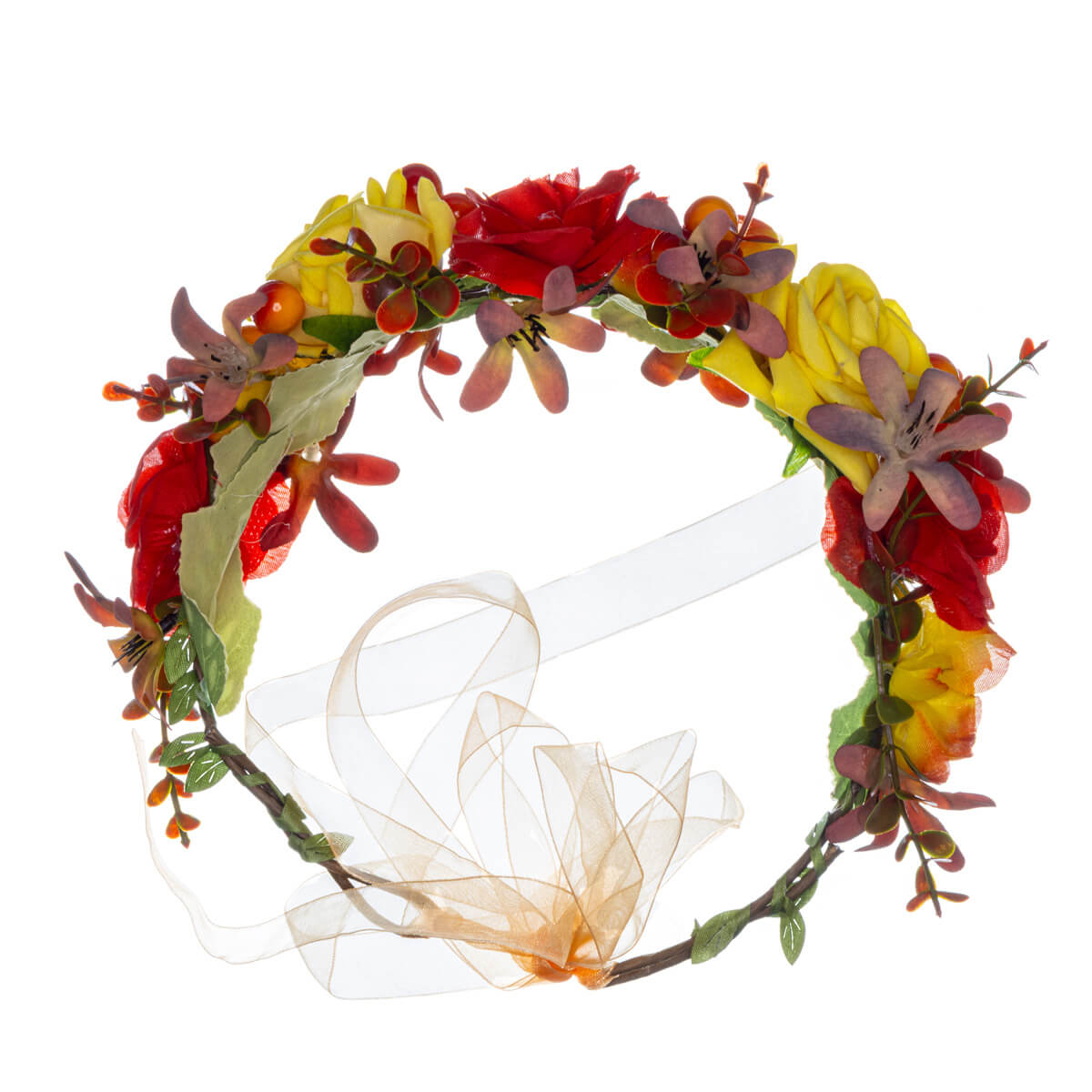 Bubblande färgglada rosor skapar ett fyrverkeri på den här kransen - det perfekta valet för midsommarafton, latinska danser eller färgstarka festivaler. Den varma färgpaletten lyser upp ditt hår som en brasa på sommarkvällen och kommer garanterat att få folk att dra öronen åt sig.