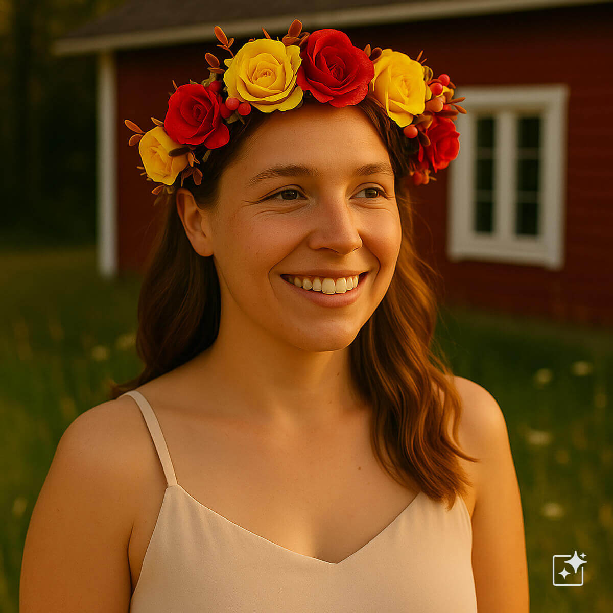 En midsommarkrans för håret är vanligtvis gjord av färska blommor och gröna blad. Vanligtvis är blommorna i en midsommarkrans gula, vita och röda. Men du kan också använda andra blommor som penséer, tungor, maskrosor eller prästkragar, som är vanliga midsommarblommor.