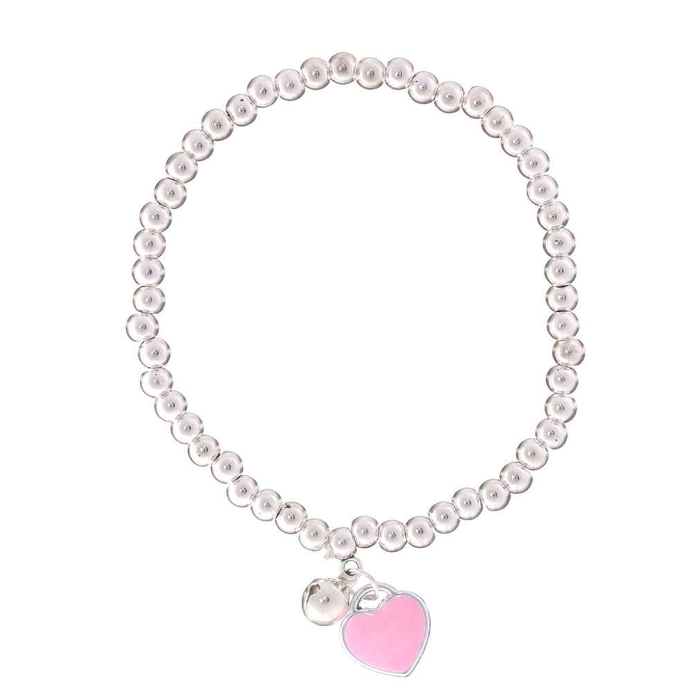 Det elastiska armbandet är lätt att sätta på handleden. En av armbanden är fasade glaspärlor och den andra är silverfärgad pärla med ett hjärthänge.