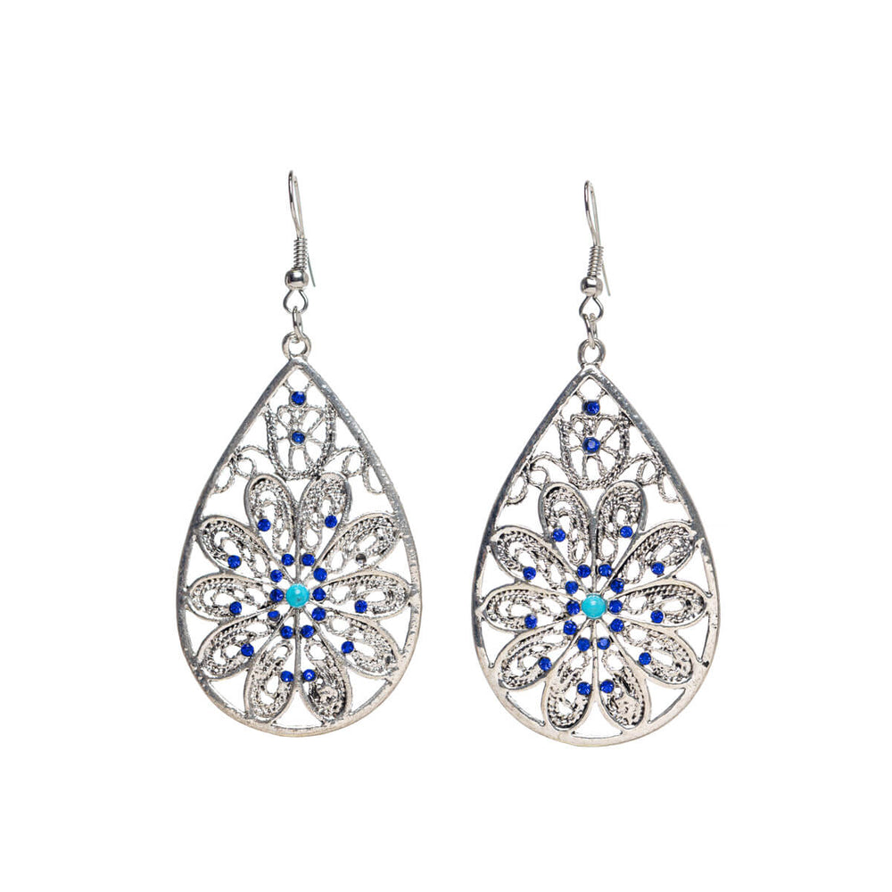 Antikt silverörhänge dekorerat med färgade glasstenar och en pärla.