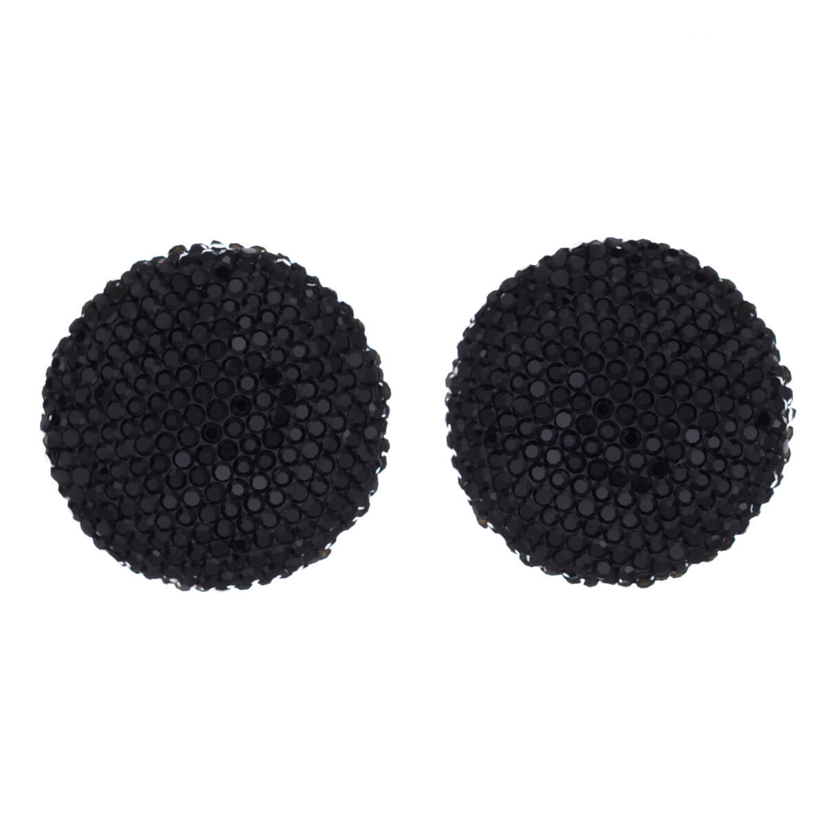 Örhängen med svarta glasstenar är perfekta för vinterns festligheter. Det platta örhänget med böjd knapp är fodrat med svarta glasstenar och passar perfekt till en liten svart klänning.