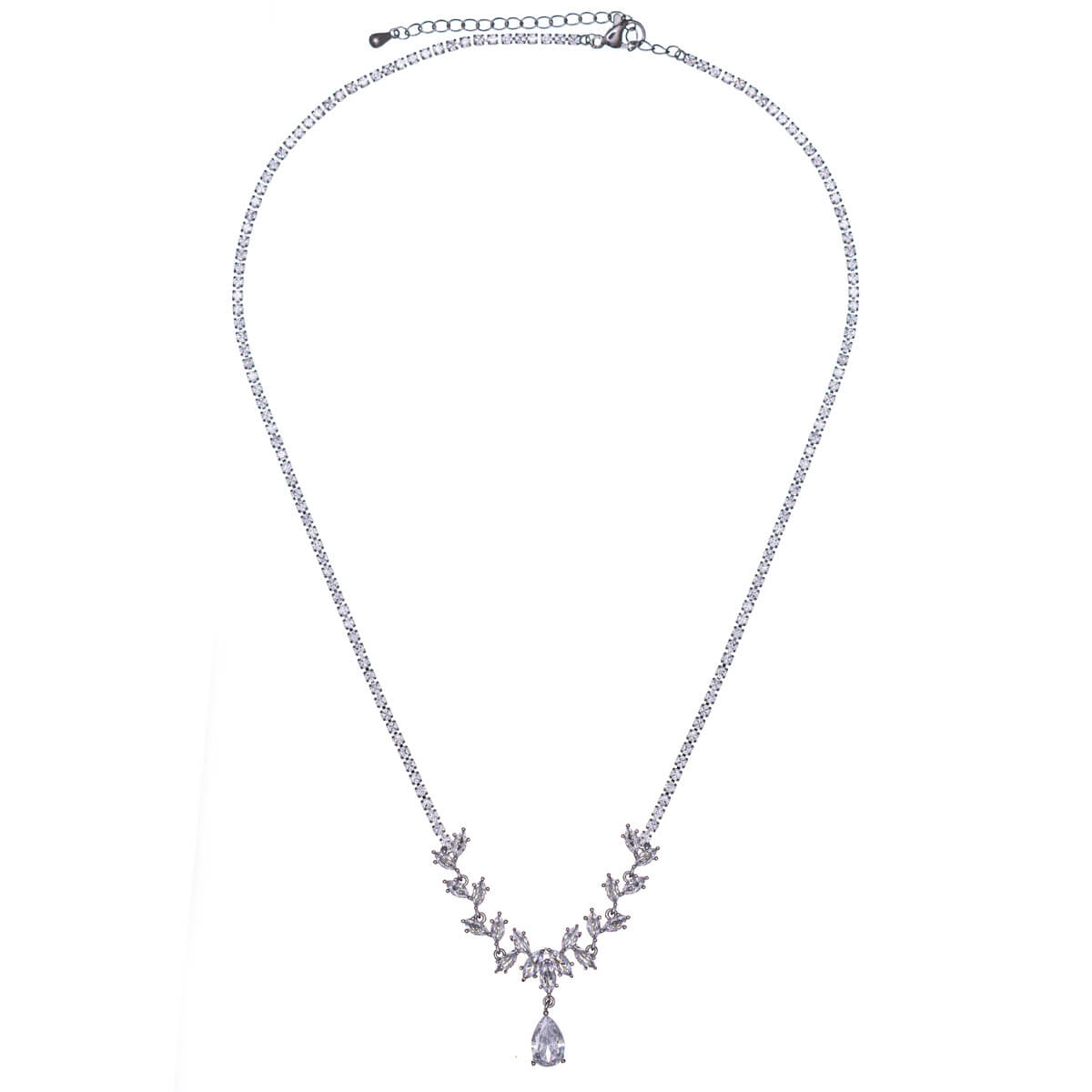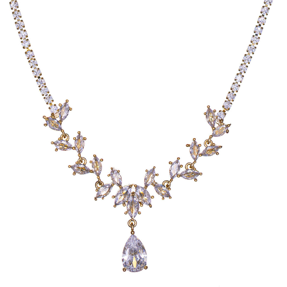 Ett elegant och iögonfallande zirkonia-halsband med ett droppformat zirkonia-hänge och marquiseformade zirkonia-stenar som bildar en vacker, vinranka-liknande helhet. Den dekorativa framsidan ger halsbandet en rik och festlig känsla, samtidigt som det behåller ett raffinerat och tidlöst utseende.
