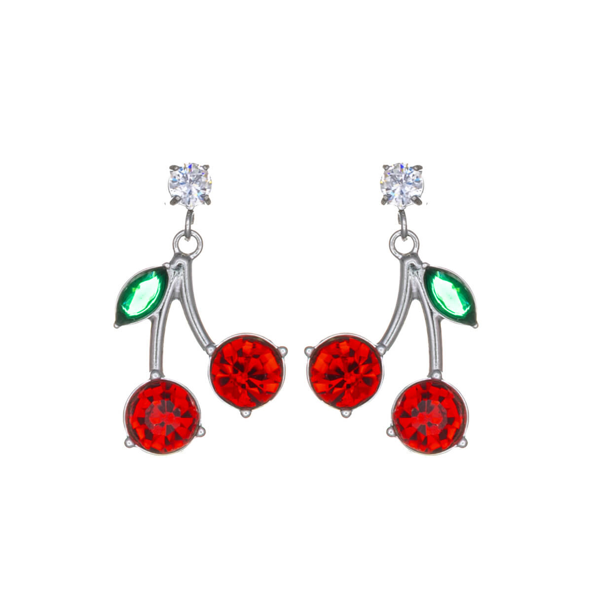 Hängande örhängen med körsbärsmotiv är ett trendigt val till din outfit. I denna modell är det zirkoniumsten som hänger som ett körsbär, dekorerat med gröna och röda glasstenar. Stålkroppen tål användning och slits inte