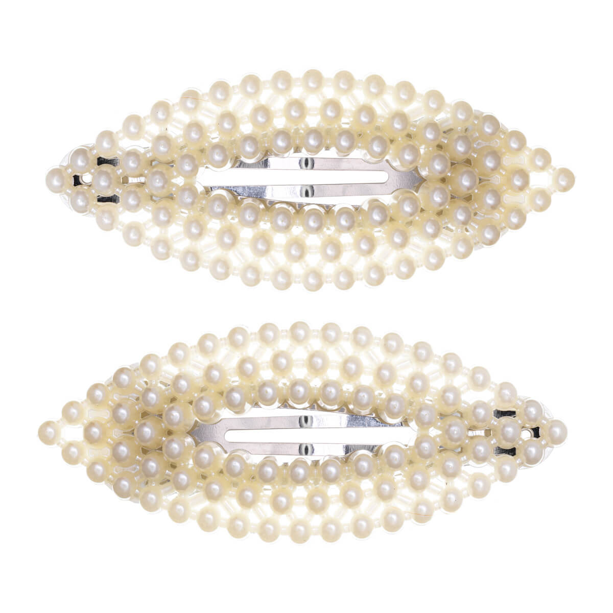 Den ovala hårklämman med pärla är en stilfull detalj. Den snärtiga klickklacken håller sidohåret på plats och ger din frisyr en färgglad touch.