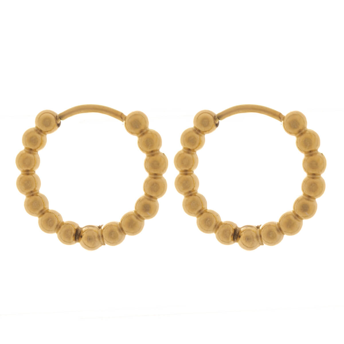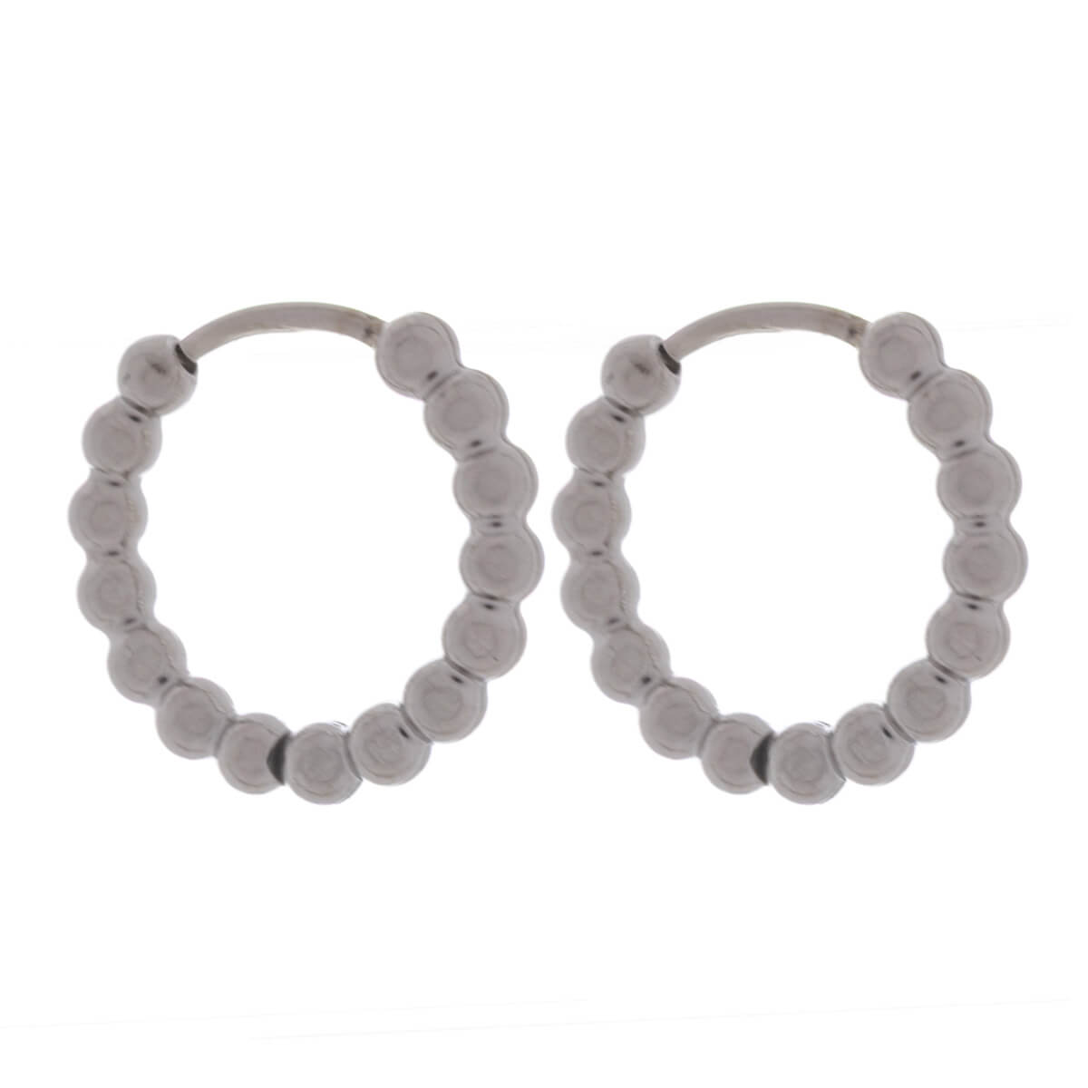 Små örhängen är lätta att bära och diskreta. I denna modell är örhängets ram formad av små kulor som är uppträdda som ett pärlhalsband. Produkten är helt tillverkad av stål.