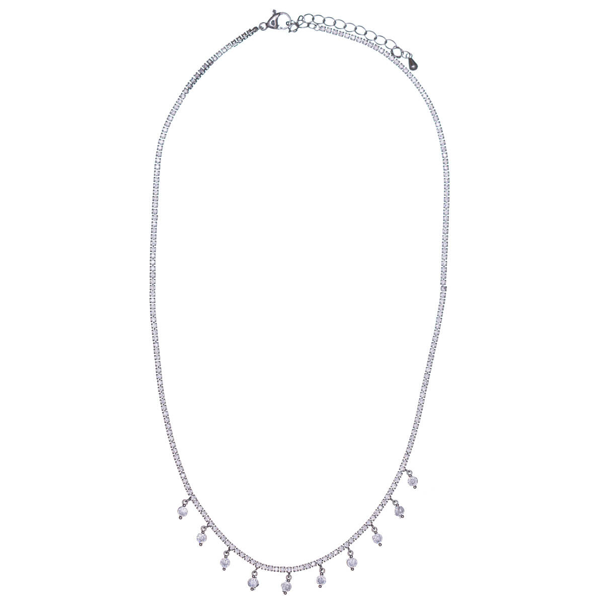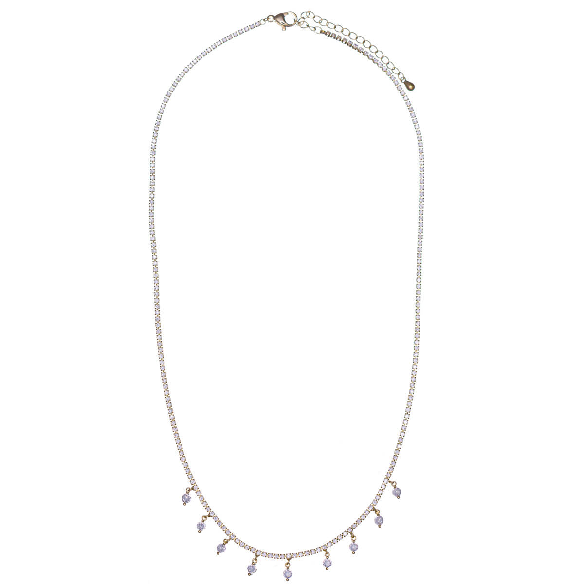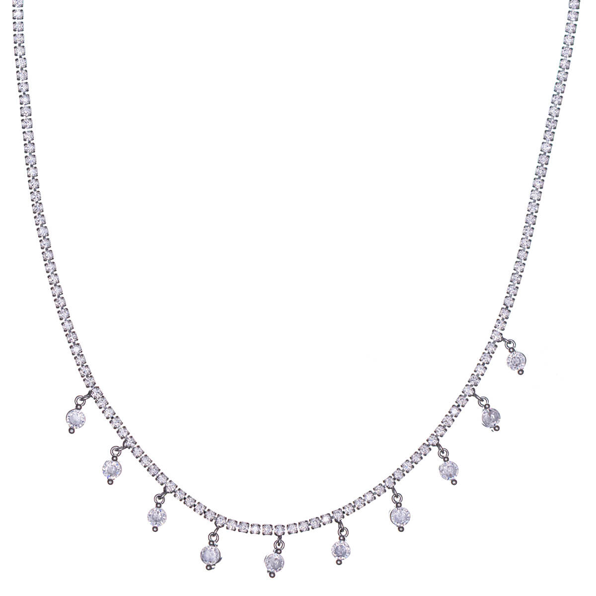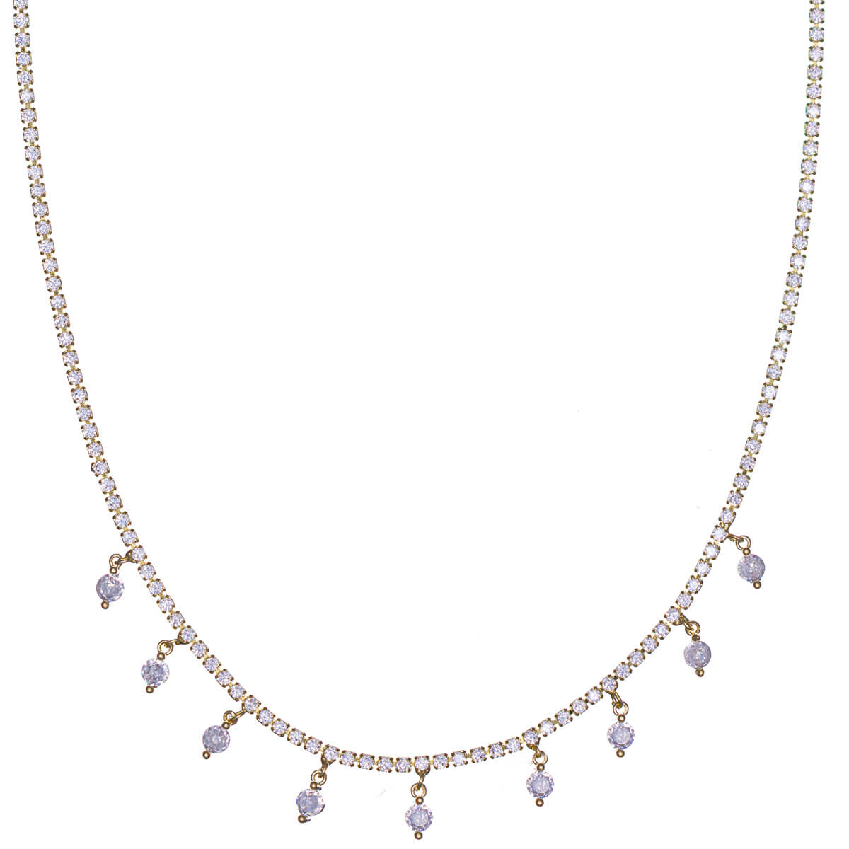 Ett elegant och lätt halsband med zirkonia med en rad dinglande zirkonia-stenar som pryder framsidan. Den sofistikerade designen ger liv och ljus till halsen, och de små, delikata hängena rör sig vackert med bäraren. Resultatet är slående men ändå diskret – det perfekta festhalsbandet utan att vara alltför flashigt.