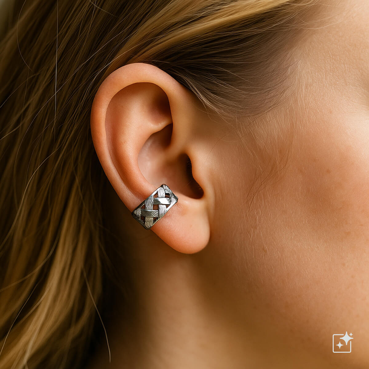 Den mönstrade ear cuffen är en snygg detalj på örat. Den enkla rustika earcuffen är vacker och tidlös. Earcuffen behöver inget hål. Brosket sitter kvar mellan örhängena och örhänget trycks nästan ihop.
