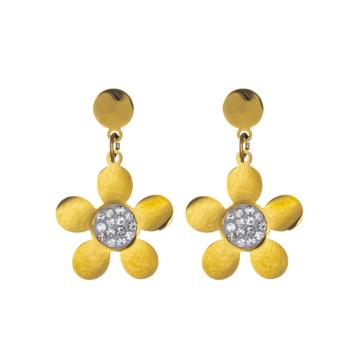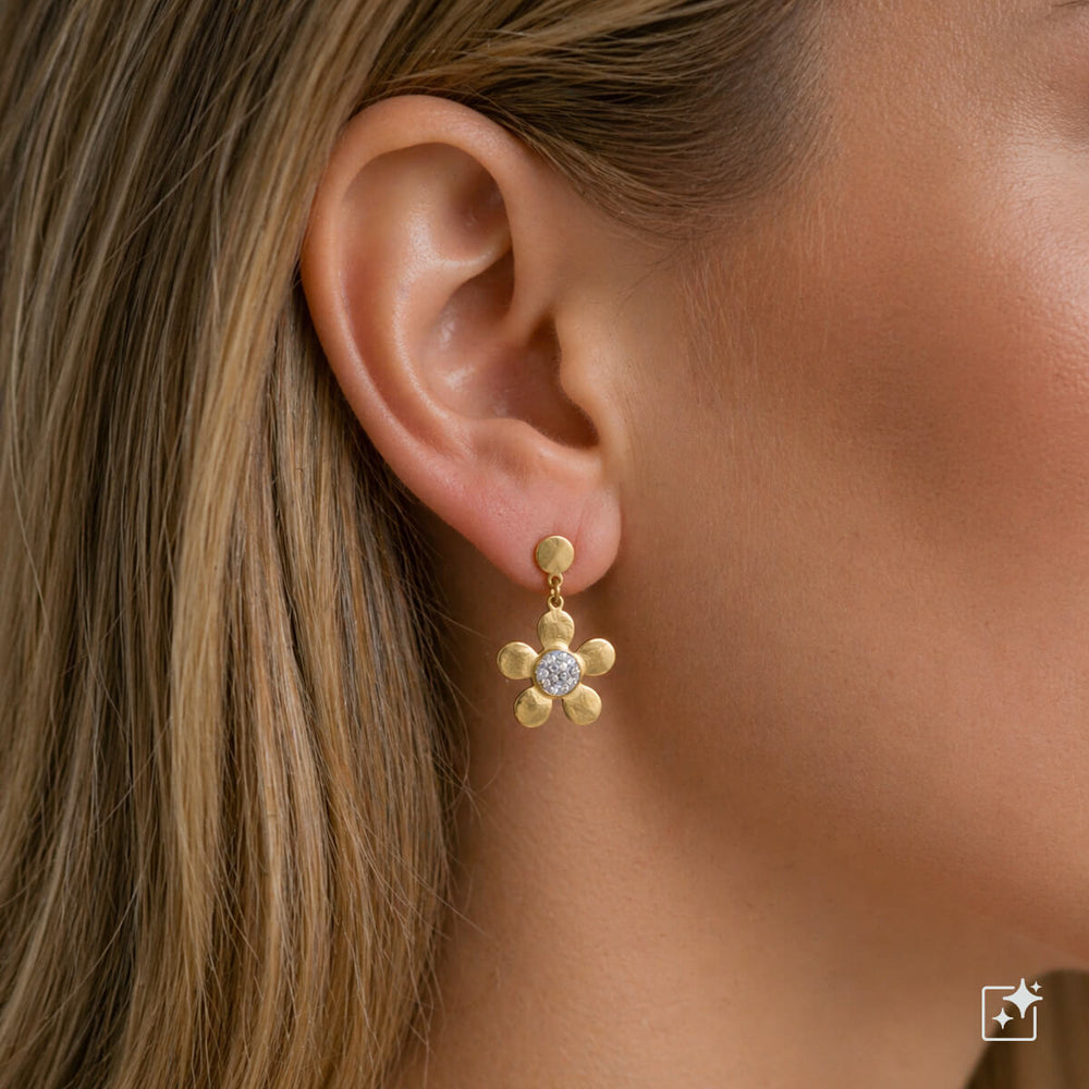 Vackra, eleganta blommiga örhängen där den klassiska blomformen kombineras med en glittrande mittdel. Den lätta och genomtänkta designen gör dessa till ett perfekt val både till vardags och till sommarfester.